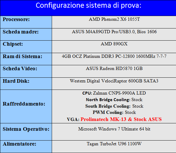 Per testare opportunamente l’efficienza del Prolimatech MK-13, e confrontarla con quella del dissipatore impiegato da ASUS, le prove sono state eseguite impostando le frequenze della scheda video sia a default e sia in overclock ai seguenti valori: