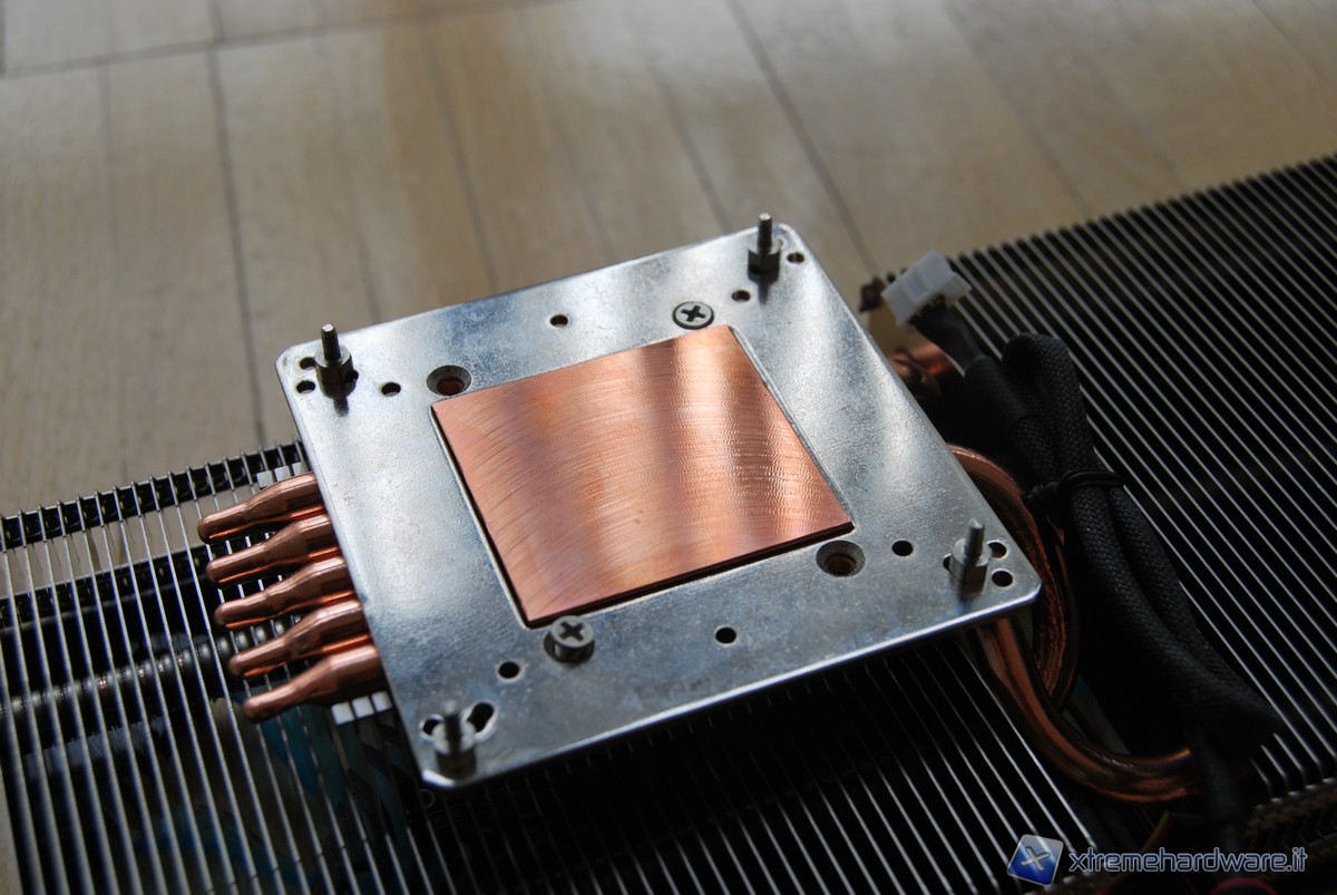 Ora siamo pronti per agganciare il dissipatore alla scheda, avvitando i bulloncini ai perni che fuoriescono dal retro. Lateralmente controlliamo l’ottimo contatto tra base e gpu, operazione necessaria per assicurarci della corretta installazione del dissipatore.