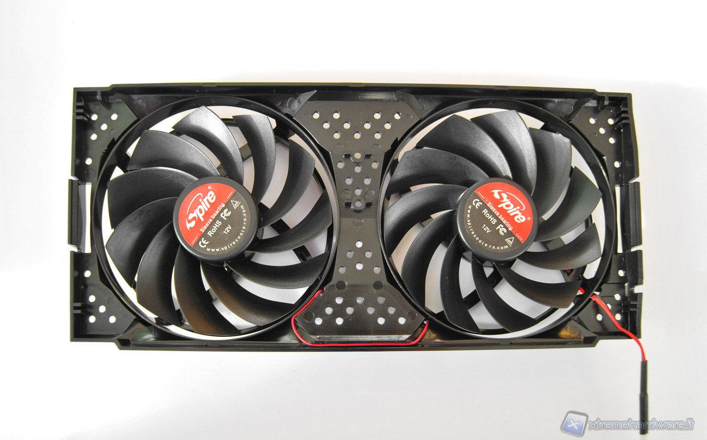 Passando ad analizzare le due ventole da 90mm di diametro, troviamo una tecnologia Sleeve Bearing, generalmente meno rumorosa rispetto al Ball Bearing, ma sicuramente anche meno longeva rispetto a quest’ultima. L'MTBF è infatti di 30000h, contro le 50000h che ci si può aspettare da una ventola di buona qualità; tuttavia Spire garantisce questo prodotto per un periodo di 3 anni. Buono sia il flusso, sia la pressione statica generata dalle ventole, grazie a una struttura delle ventole a ben 11 pale. Lo spessore delle stesse è molto ridotto, appena 1,5 cm, al fine di ridurre a soli due slot aggiuntivi (oltre allo slot in cui è inserita la scheda) l’occupazione di spazio dello Spire Slimod. Il dissipatore è in grado di occupare un solo slot nel caso d’installazione senza ventole, ma sconsigliamo questa modalità per schede video di fascia media o alta.