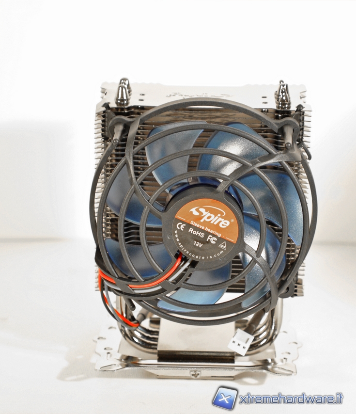 La sua ventola misura 98*98*35mm ed è in grado di spostare un flusso d’aria pari a 53.12CFm a 2700rpm con una rumorosità attestata sui 25dB(A), non proprio silenziosa ma comunque non fastidiosa se il case è situato almeno ad 1m circa da noi. La tensione nominale della ventola è di 12V, mentre la sua potenza di 2.4W. Il motore è di tipo Sleeve Bearing ed è garantito per una durata pari alle 30.000 ore di utilizzo. Infine la pressione statica della ventola è pari a 3.68mm H2O, un buon valore che consente al flusso di attraversare il corpo dissipante nella sua interezza senza fuoriuscire lateralmente.