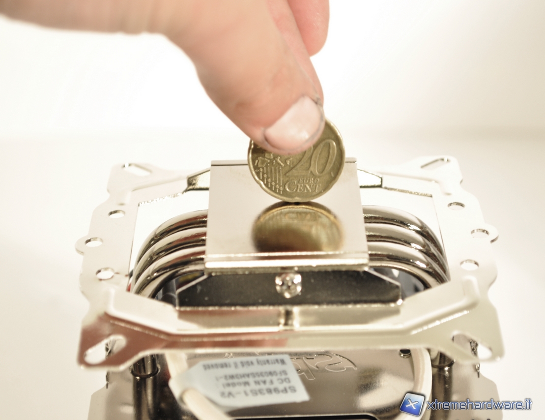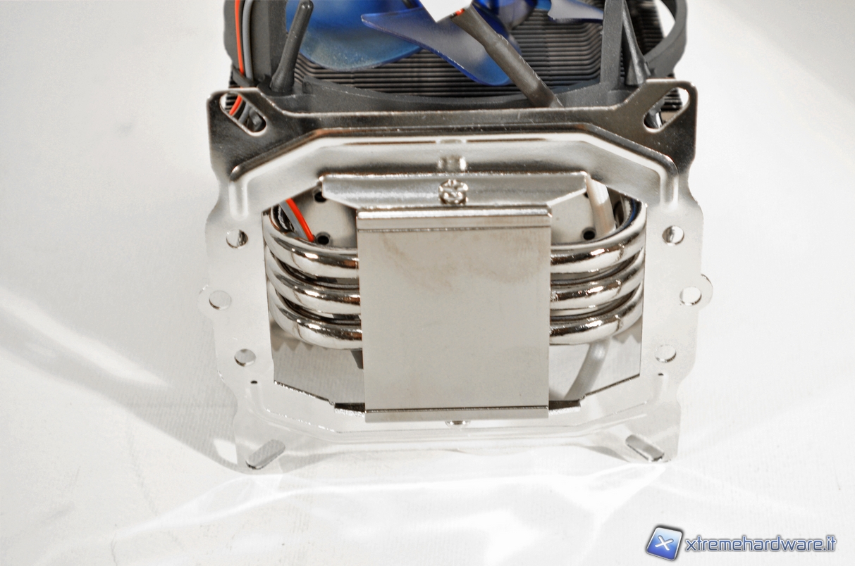 Nella prima immagine possiamo notare le 3 heatpipes da 6mm saldate sulla base in rame,. Sia la base, sia le heatpipes hanno subito un processo di nichelatura per migliorarne l’aspetto esteriore e prevenire fenomeni di ossidazione. La basepresenta una discreta lappatura che permettere un miglior scambio di calore fra la superficie del dissipatore e la cpu.