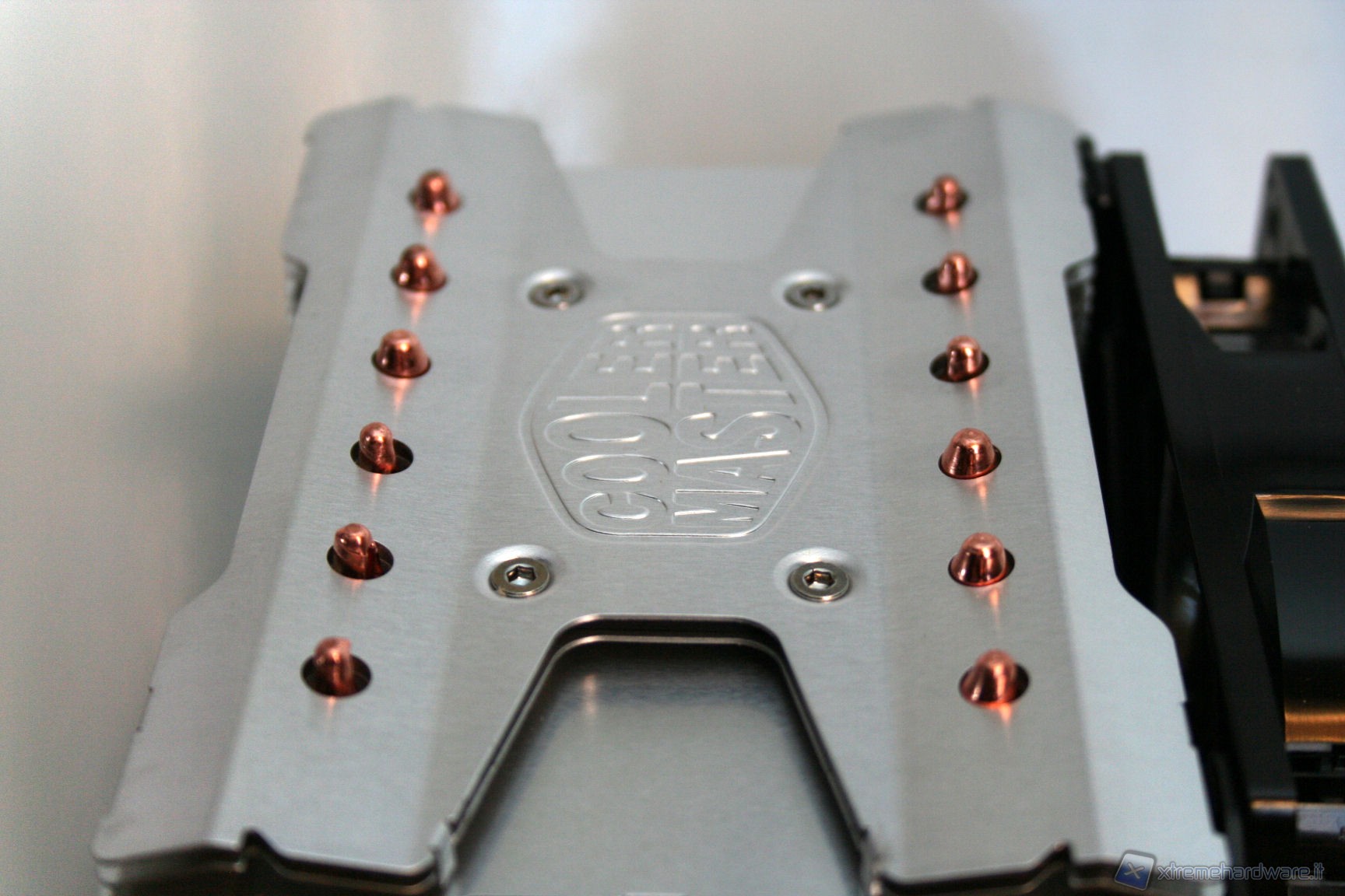 Cosa possiamo aspettarci da questo dissipatore? Indubbiamente, date le generose dimensioni non possiamo fare altro che pretendere un risultato complessivo di buon livello. Data anche la solidità strutturale, la conformazione classica rivisitata con nuovi accorgimenti, le finiture ed il buon assemblaggio, sicuramente sarà molto difficile non rimanere soddisfatti. Iniziando l’analisi dall’alto, Cooler Master ha installato una nuova placca superiore, che riporta il logo caratteristico dell’omonima casa costruttrice. La finitura è eccellente, come del resto la lavorazione finale delle heatpipe nella parte superiore. Heat-pipe e base sono in rame a vista, senza quindi trattamento di nickelatura, che solitamente protegge da ossidazioni e alterazioni del colore.