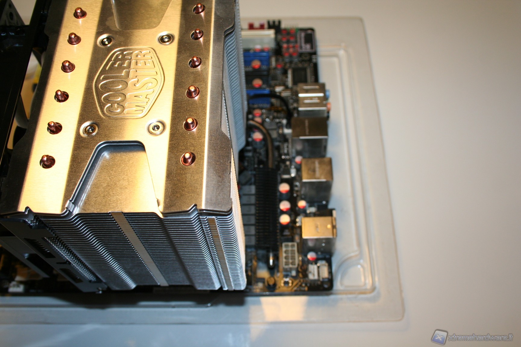 Successivamente è necessario posizionare il dissipatore capovolto ed inserire la scheda madre, facendo attenzione alle fessure. Al termine dell’inserimento applichiamo il backplate e serriamo le viti a brugola, con forza ma prudentemente, con l’apposito utensile proprietario di Cooler Master.