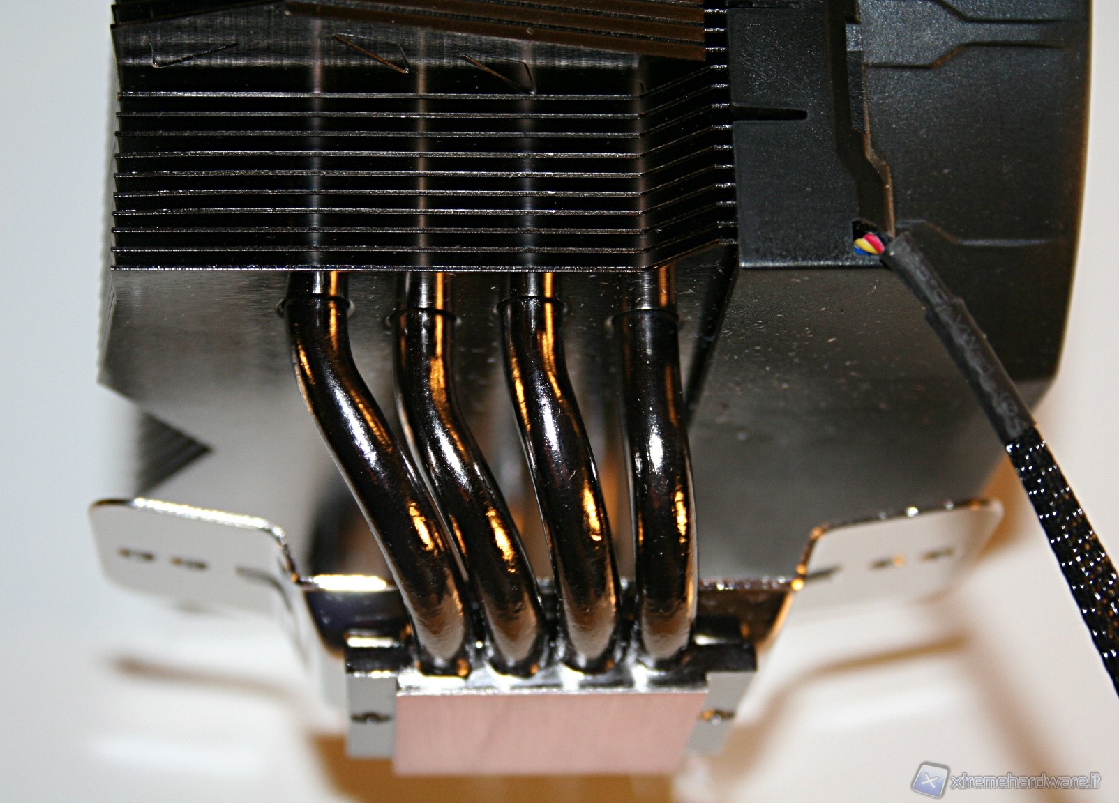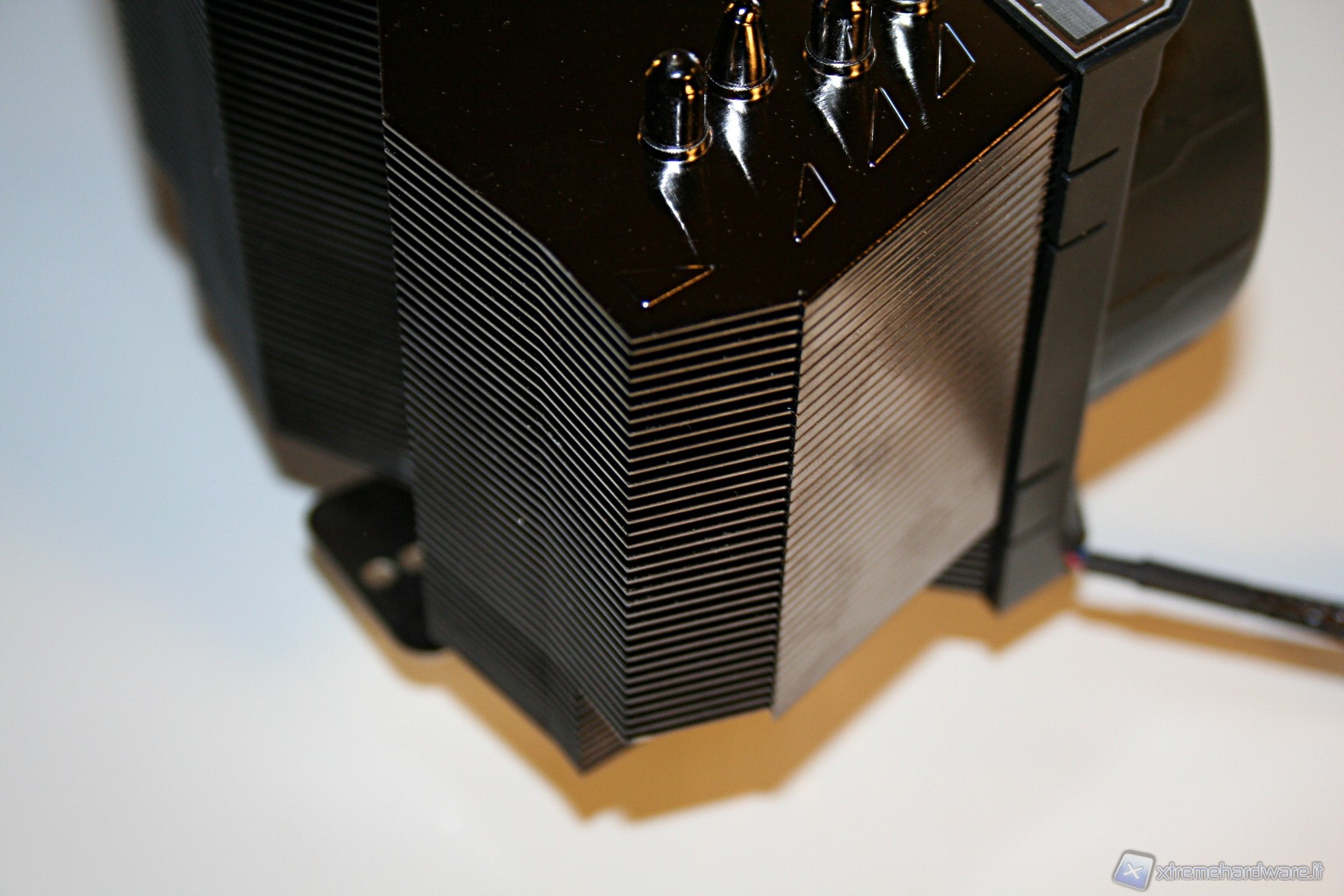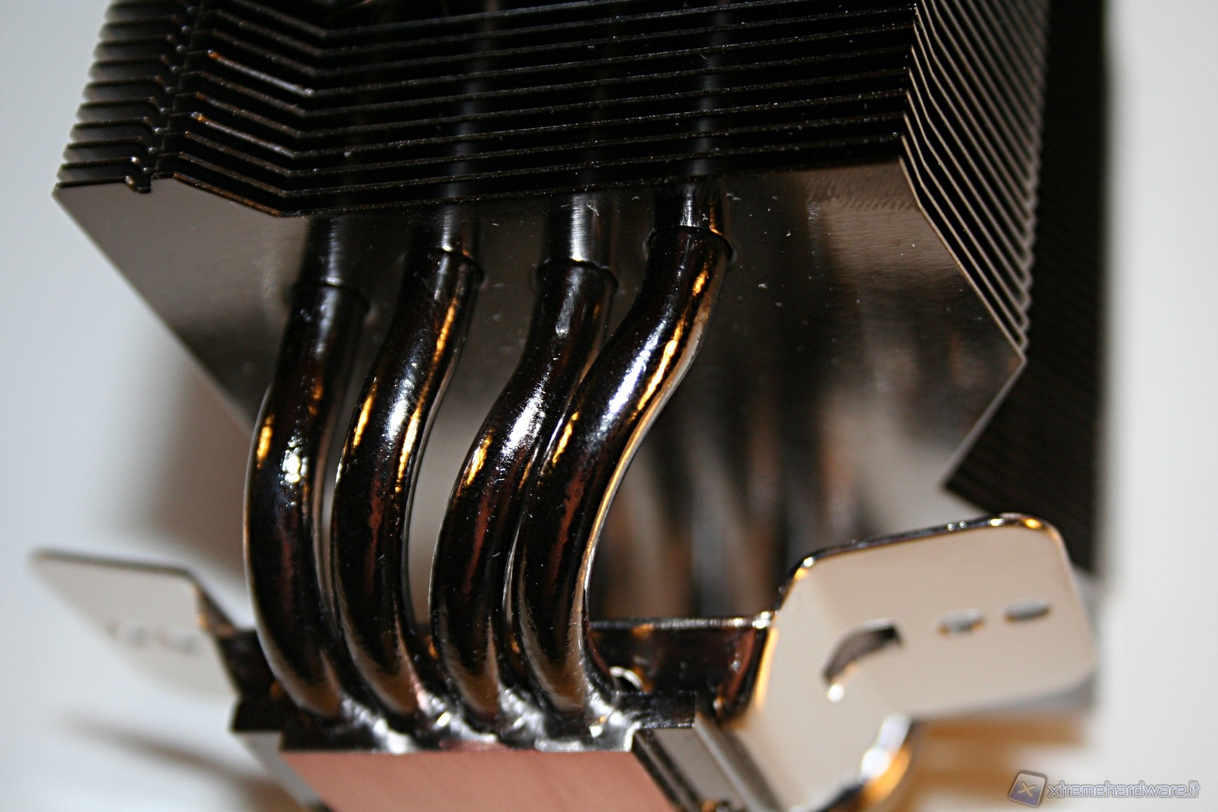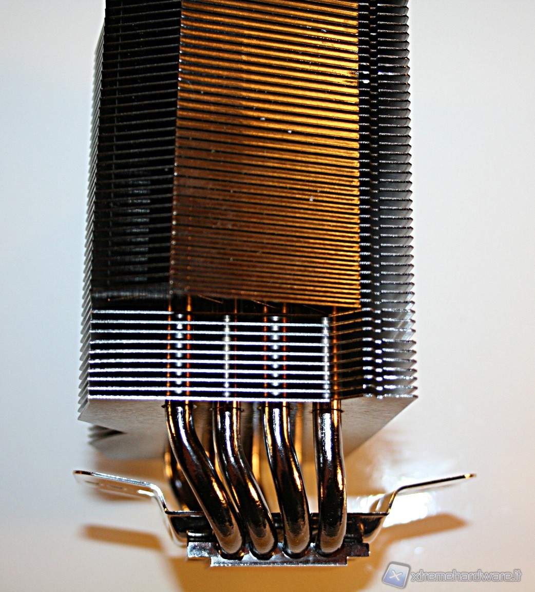 La finitura delle heat pipes è davvero eccellente, tant’è che nella parte superiore c’è il classico cappuccio terminale, che conferisce un’ottima estetica al prodotto. Notiamo inoltre che il posizionamento delle heat pipes è leggermente sfalsato, in modo tale che vengano investite da un leggero flusso d’aria. La solidità strutturale è esemplare e le saldature delle heat pipes, sia sulle alette che sulla base, sono di ottima qualità.