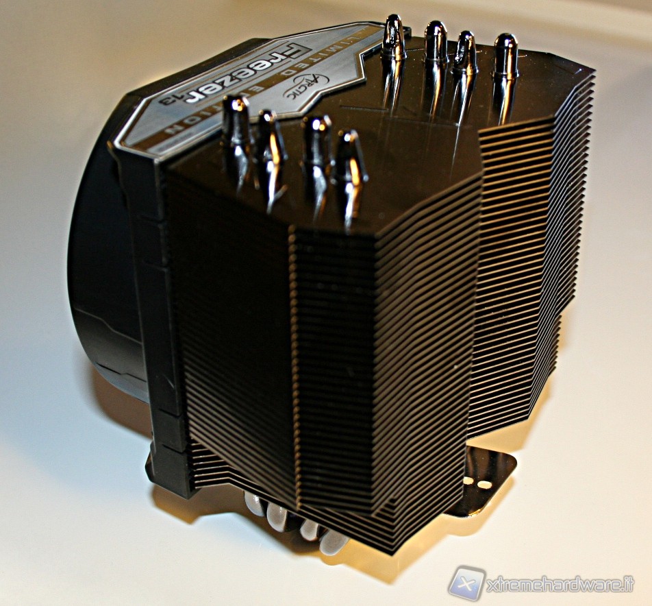 Confrontandolo con le altre serie Freezer 13, le uniche differenze sostanziali che rileviamo, sebbene però siano importanti, sono in merito alla qualità costruttiva ed alla ventola utilizzata. In questo caso siamo ai massimi livelli, diversamente dagli altri della stessa famiglia. Ci sono 45 alette in alluminio, con placcatura al titanio e 4 heat pipes in rame, con struttura ad ‘’U’’ con diametro di 6mm, che si vanno a congiungere con la base in rame con finitura al nickel