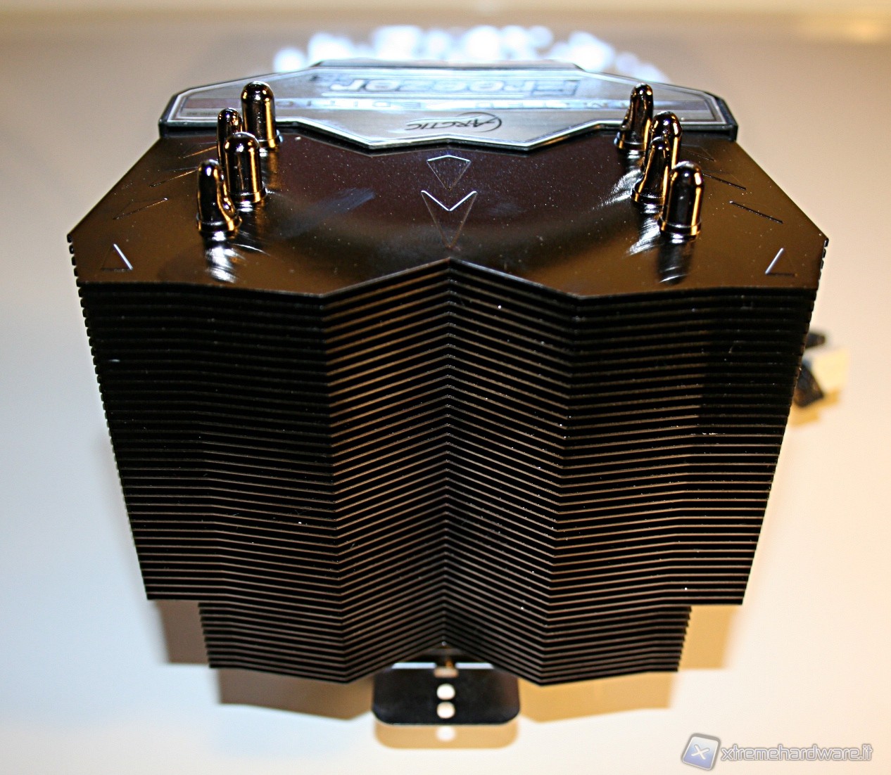 La struttura è molto particolare, seppure comunque sia della tipologia a torre, ben comune ed ormai divenuta quasi uno standard nel mercato dei dissipatori per CPU. La parte frontale ed interna alle alette è standard mentre quella laterale e posteriore presenta delle peculiarità: il design utilizzato permetterà la creazione di un flusso d’aria ottimale, che porterà ad una maggiore efficienza nella dispersione termica del calore, dovuta alla mancanza di zone morte prive di aerazione. Precisiamo inoltre che su ogni aletta ci sono dei piccoli disegni con motivi a freccia e la parte laterale delle alette è chiusa; in tal modo si formerà un unico canale d’aria rivolto verso la porzione posteriore del dissipatore, e del case. La spaziatura tra le alette è di 0,5mm solo che, data la ventola utilizzata e data la profondità del dissipatore, questo ci porterà a pensare che sarà necessario avere una velocità di rotazione elevata, al fine di mantenere un’efficienza elevata. Lo scopriremo presto.