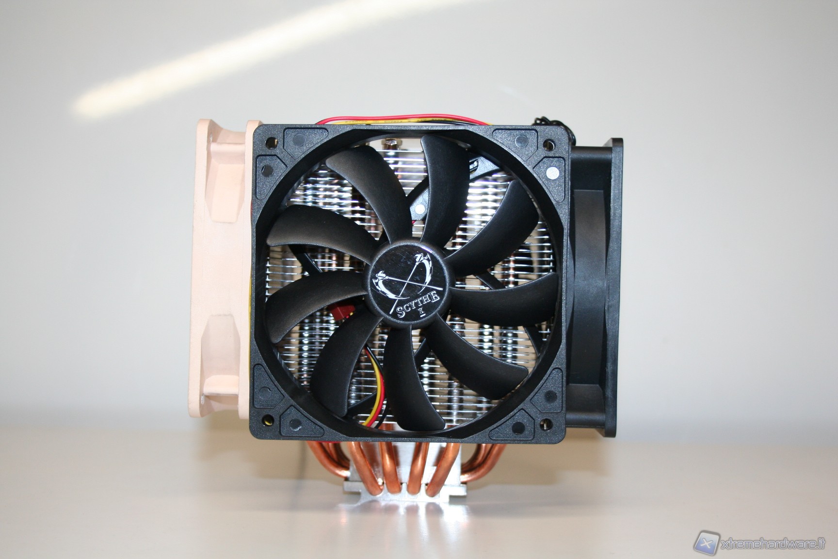 Considerando le possibilità intrinseche di questo dissipatore abbiamo pensato che sarebbe stato interessante testarlo anche con più ventole lateralmente. E’ stata usata una configurazione avente tre ventole Scythe Slip Stream da 800RPM con posizionamento in Push, sinistro e destro, mentre in pull non è stata posizionata nessuna ventola, per evitare di ostruire il passaggio dell’aria e quindi potenzialmente compromettere i flussi generati dalle tre ventole. Ricordiamo che sarebbe possibile eventualmente montarne 4 ma consigliamo al massimo di metterne solamente tre, in PUSH+2laterali oppure PULL+2laterali. Purtroppo, e ci scusiamo per l’inconveniente, non ci è stato possibile mettere le foto del Ninja 3 con le 3 ventole Slip Stream, poiché, a causa di un errore tecnico, sono andate perdute. A titolo puramente illustrativo vi mostriamo la stessa configurazione 3x Push ma con ventole diverse.