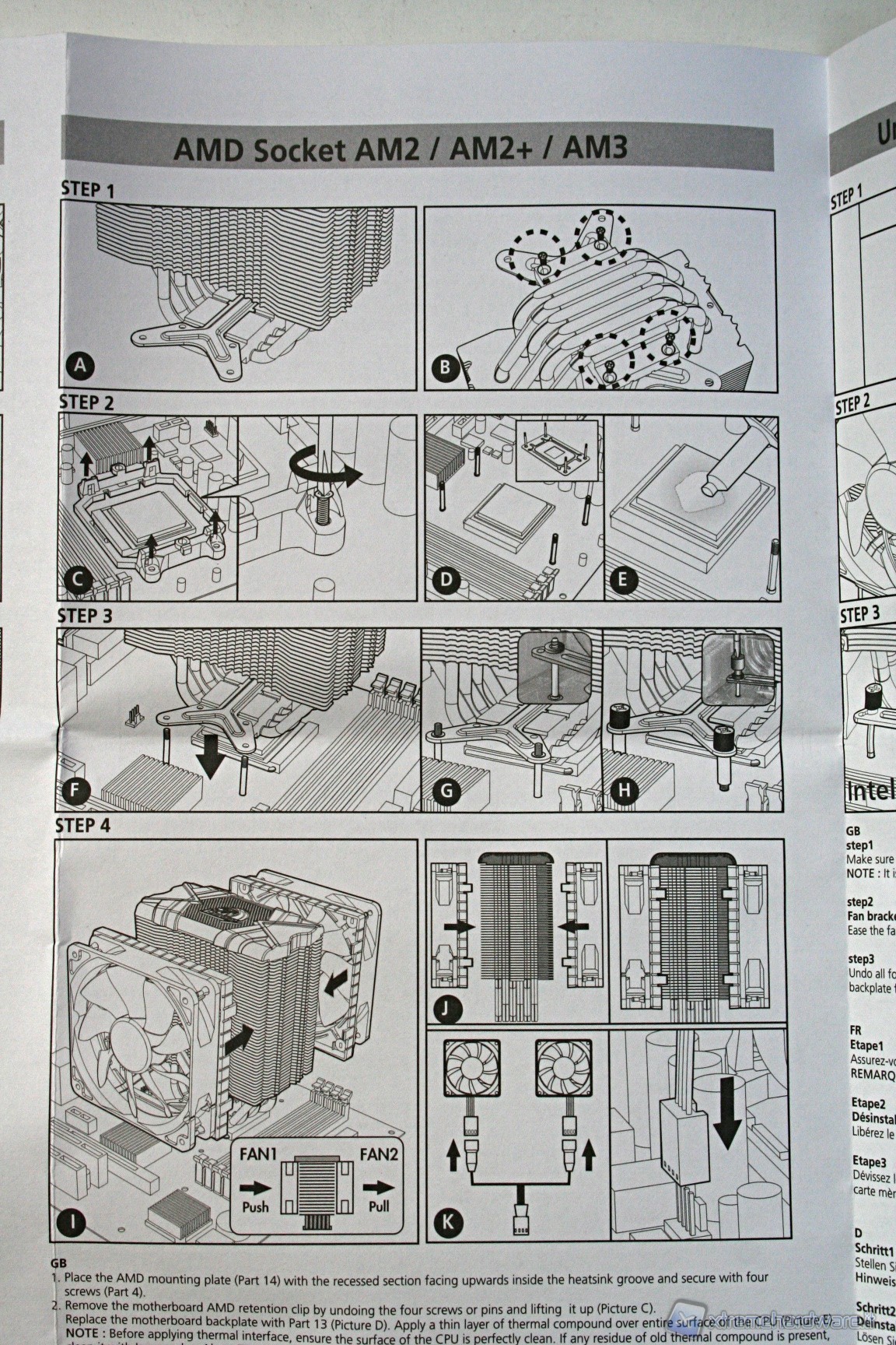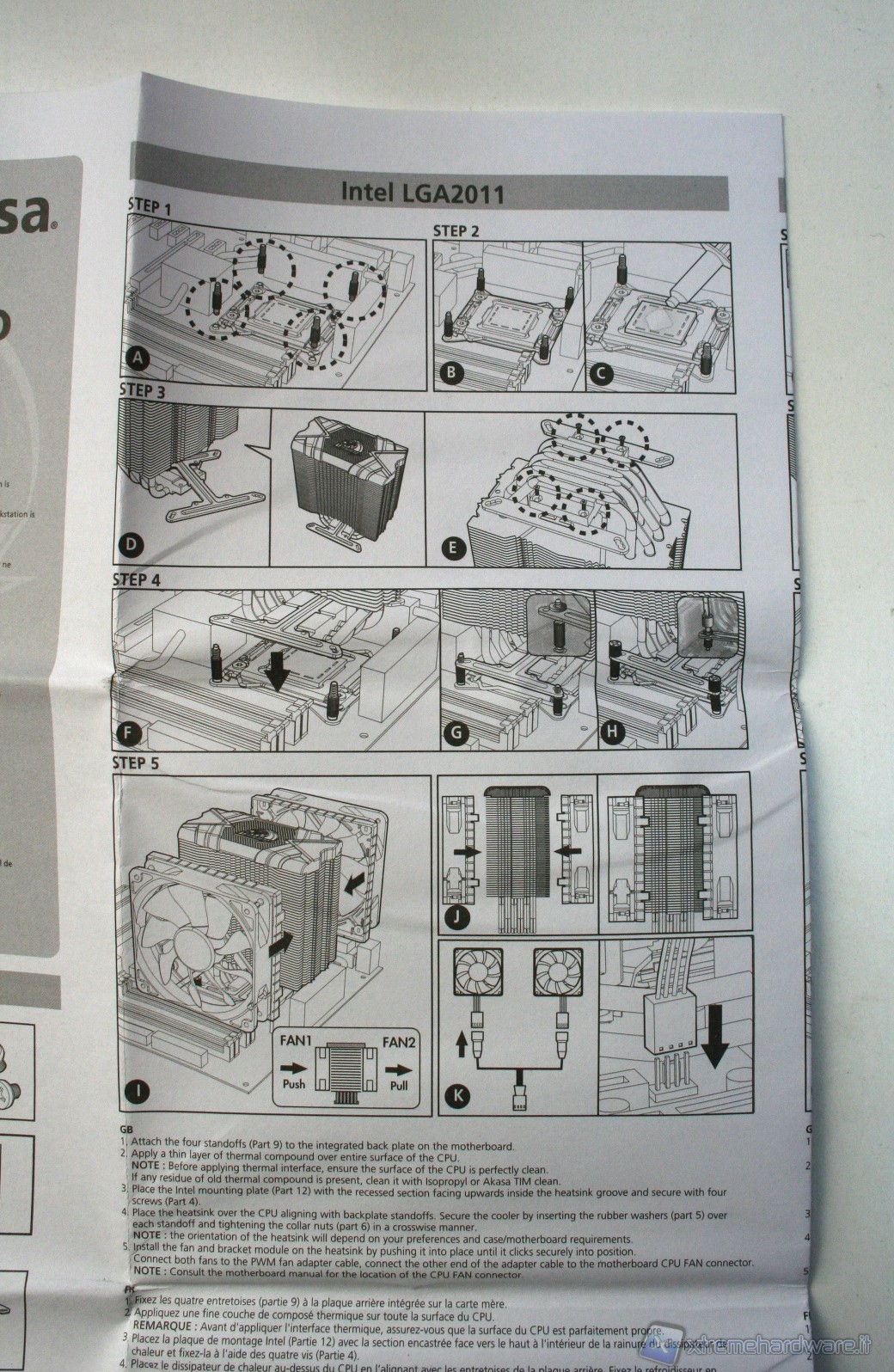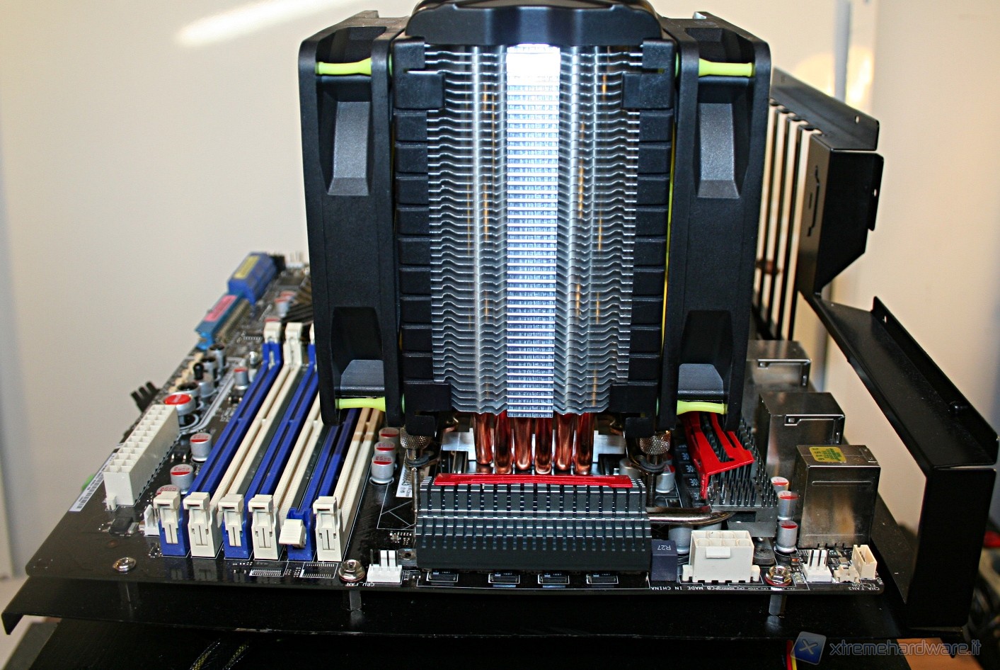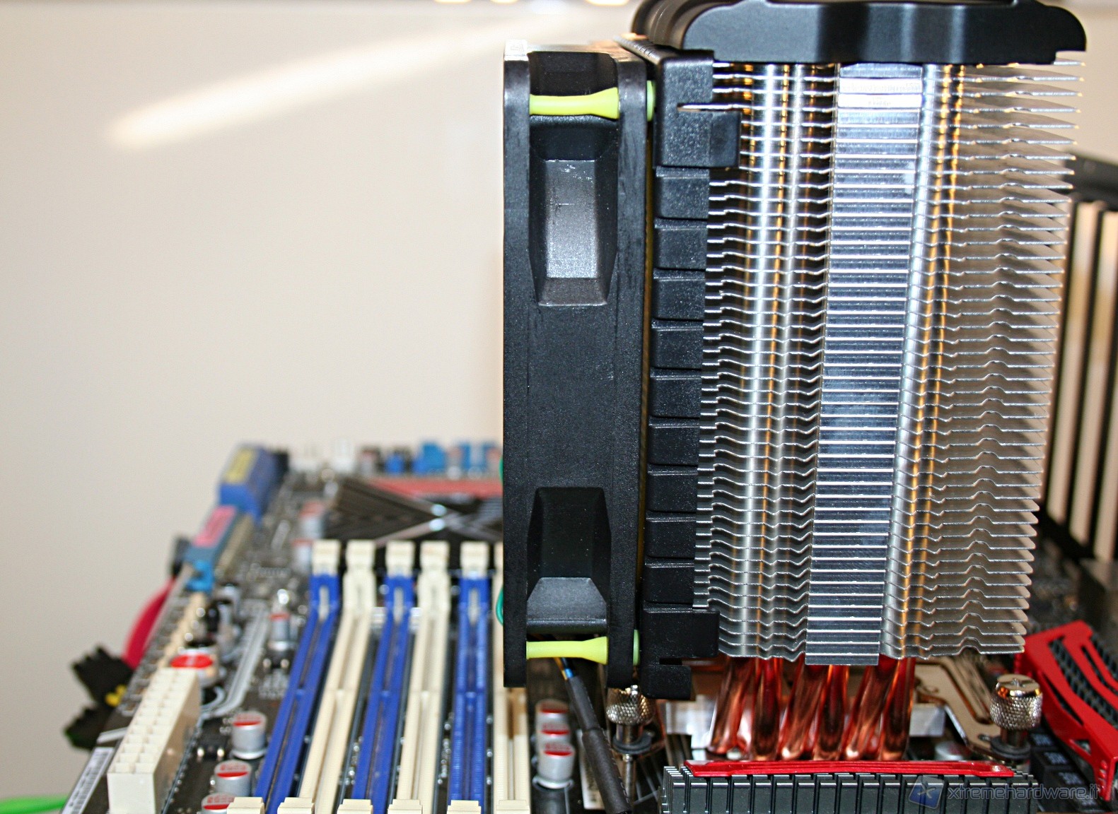 Il montaggio è facile ed è tutto molto stabile, una volta completata l’operazione. Unica nota negativa, sebbene le dimensioni complessive risultino contenute, è che montando la ventola da 120mm in configurazione Push, ovvero come viene fornita di fabbrica, si va ad ostruire il primo banco di RAM, se queste ultime sono ad elevato profilo. E’ eventualmente possibile installare la sola ventola in configurazione pull, permettendo così di popolare tutti i sei slot di RAM disponibili. Facciamo notare inoltre che il montaggio è stato effettuato su una ASUS X58 P6T Deluxe V2: in altre schede madri in cui la distanza degli slot dal socket è inferiore, la ventola potrebbe interferire con altri slot addizionali anziché solo il primo. Abbiamo posizionato il dissipatore con la ventola in immissione rivolta verso i banchi di RAM. Questa è la configurazione migliore in un cabinet poiché si crea un flusso che tende a spingere l’aria calda verso l’esterno, omogeneo con quello creato dalle altre ventole presenti nel case.