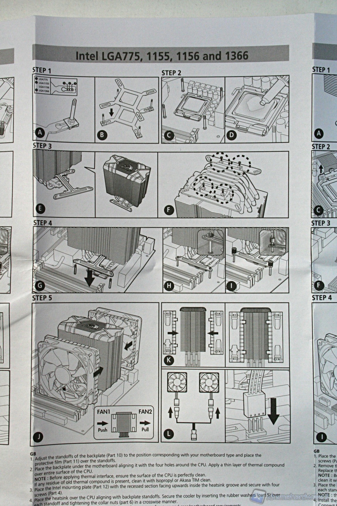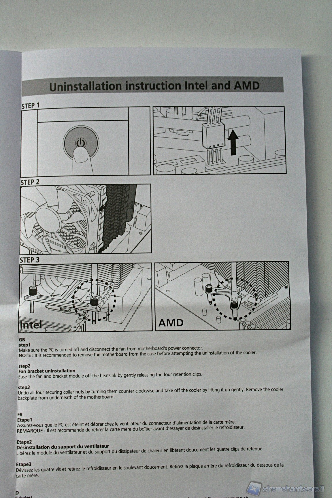 In questo paragrafo analizzeremo velocemente il montaggio per sistemi Intel: esso è molto semplice, è necessario seguire solo le illustrazioni e in poco tempo si riesce nell’intento. Come prima cosa è necessario assemblare le due staffe metalliche laterali ai lati del dissipatore, facendo attenzione al verso, e poi inserire le quattro viti. Fatto questo, nel caso dei processori Intel, bisogna montare il backpalte sulla parte posteriore della scheda madre, rigirare la scheda madre e posizionare il dissipatore sul backplate, infine far combaciare i fori sulle viti che partono da quest’ultimo. Prima di quest’ultima operazione, ricordatevi di applicare la pasta termica sulla CPU e di rimuovere la pellicola in plastica presente sulla base del dissipatore. Al termine bisogna serrare le piccole brugole con moderazione e senza andare a fine corsa. Nel caso in cui invece nel vostro cabinet sia presente il foro in corrispondenza del socket della CPU, è possibile inserire dal basso le piccole viti di montaggio e procedere all’operazione. Controlliamo infine se è tutto ben saldo e stabile e se la base del dissipatore è a diretto contatto con la CPU.