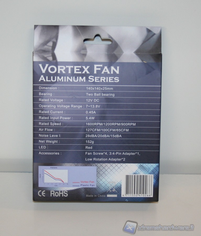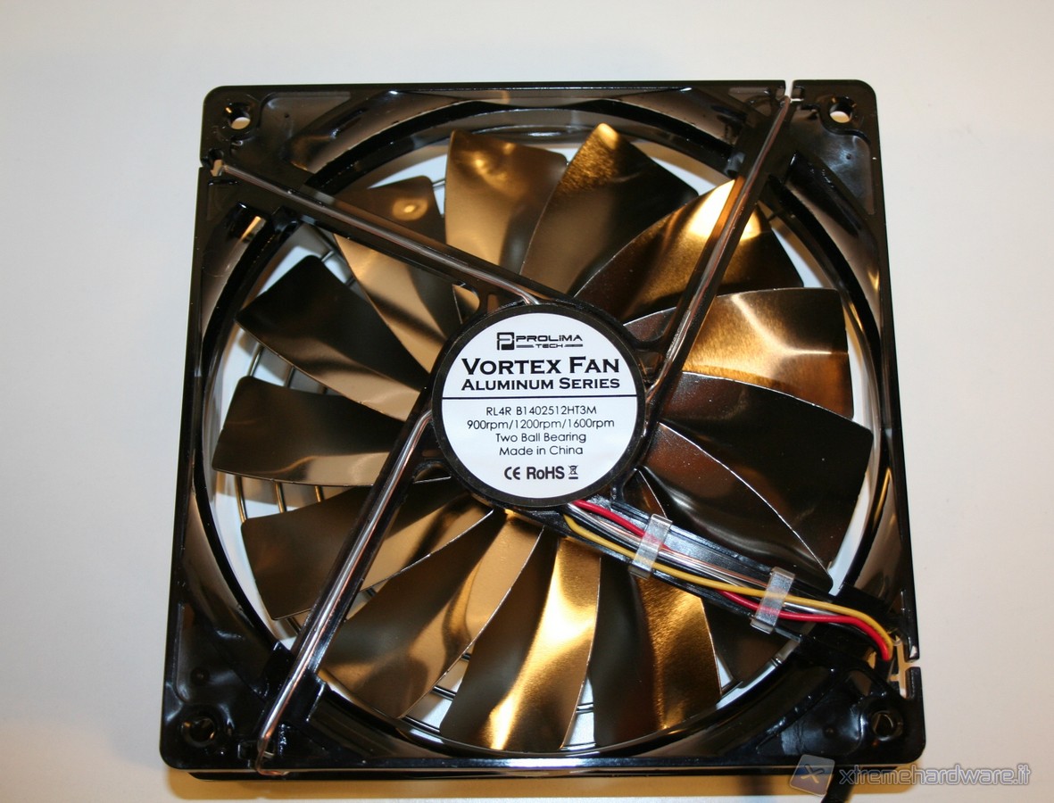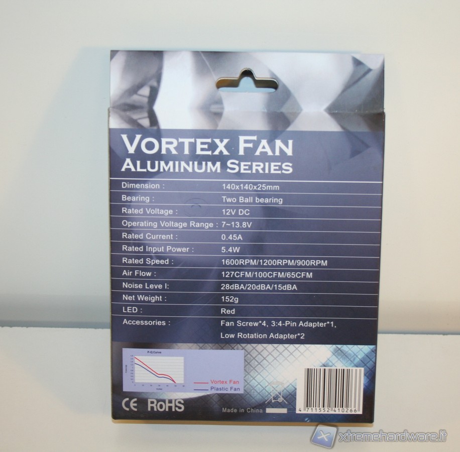 La Vortex Aluminum Series rappresenta una delle più potenti ventole da 140mm attualmente presenti sul mercato. L’imponente quantitativo di CFM assieme al contenuto rumore di fondo complessivo permette a questa ventola di essere il candidato ideale laddove si richiede un’elevatissima pressione statica, alto CFM e quella sicurezza che solo una, o più, ventola/e del genere può/possono dare. La struttura in ABS unita alle 13 pale in alluminio conferisce a questa ventola un aspetto molto particolare. Apprezzabile la scelta di fornire una griglia di protezione, anche perché essendo il materiale alluminio potrebbe esserci un serio pericolo per la vostra sicurezza ed in particolare per le vostre dita. Come già accennato sono presenti ben 13 pale, particolarmente sovrapposte al fine di aumentare sia il flusso d’aria, sia la pressione statica. Inoltre il motore non è più il comune, Sleeve Bearing bensì il più rumoroso Two Ball Bearing, che conferisce però alla ventola una durata di vita maggiore. Questa ventola, similmente alle Vortex Red Led, presenta quattro LED di colore rosso, molto belli all’interno del case.