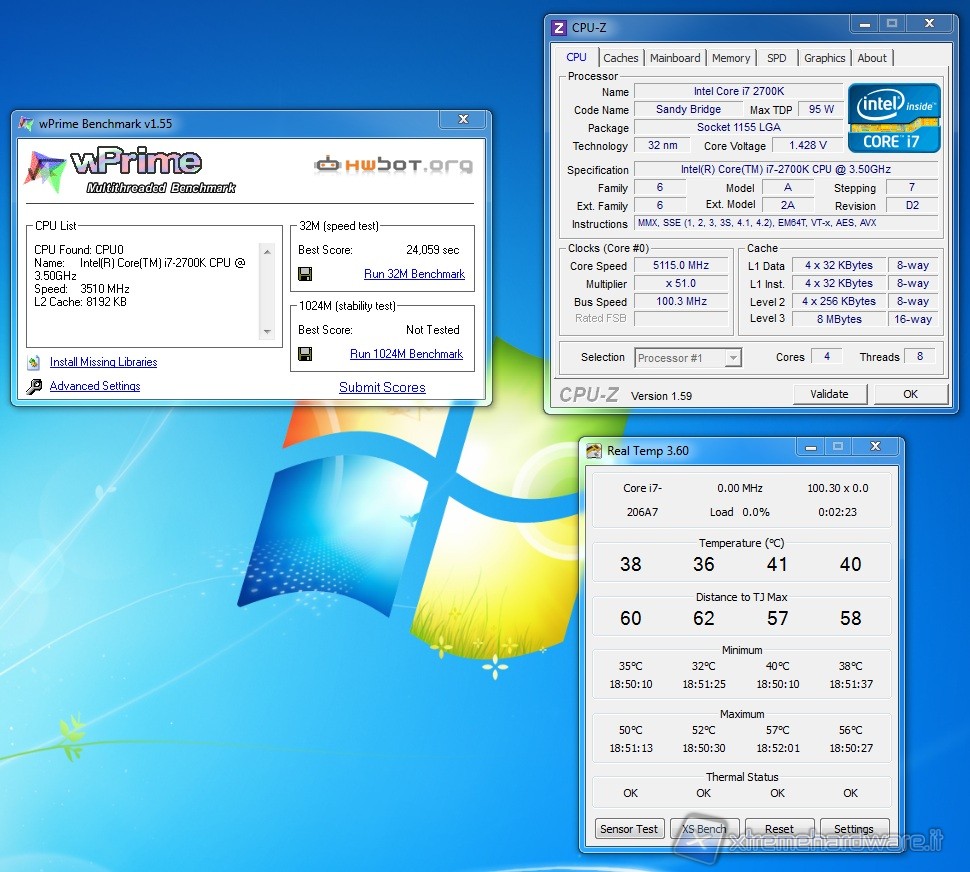 Sono ottime le performance complessive, specialmente se rapportate al dissipatore stock Intel. Consigliamo l’aggiunta di una seconda ventola, al fine di migliorare ulteriormente le performance e diminuire la rumorosità complessiva, settandole a regimi di rotazione inferiori. Riportiamo anche degli screen dell’overclock massimo raggiunto. Il dissipatore stock Intel non è stato in grado di reggere la configurazione in overclock, dato che già a default le temperature erano decisamente elevate. Con 1,45V è stato possibile raggiungere la frequenza di 5115MHz; è stato persino possibile conseguire un test di SuperPi da 32 MB e wPrime da 32M.
