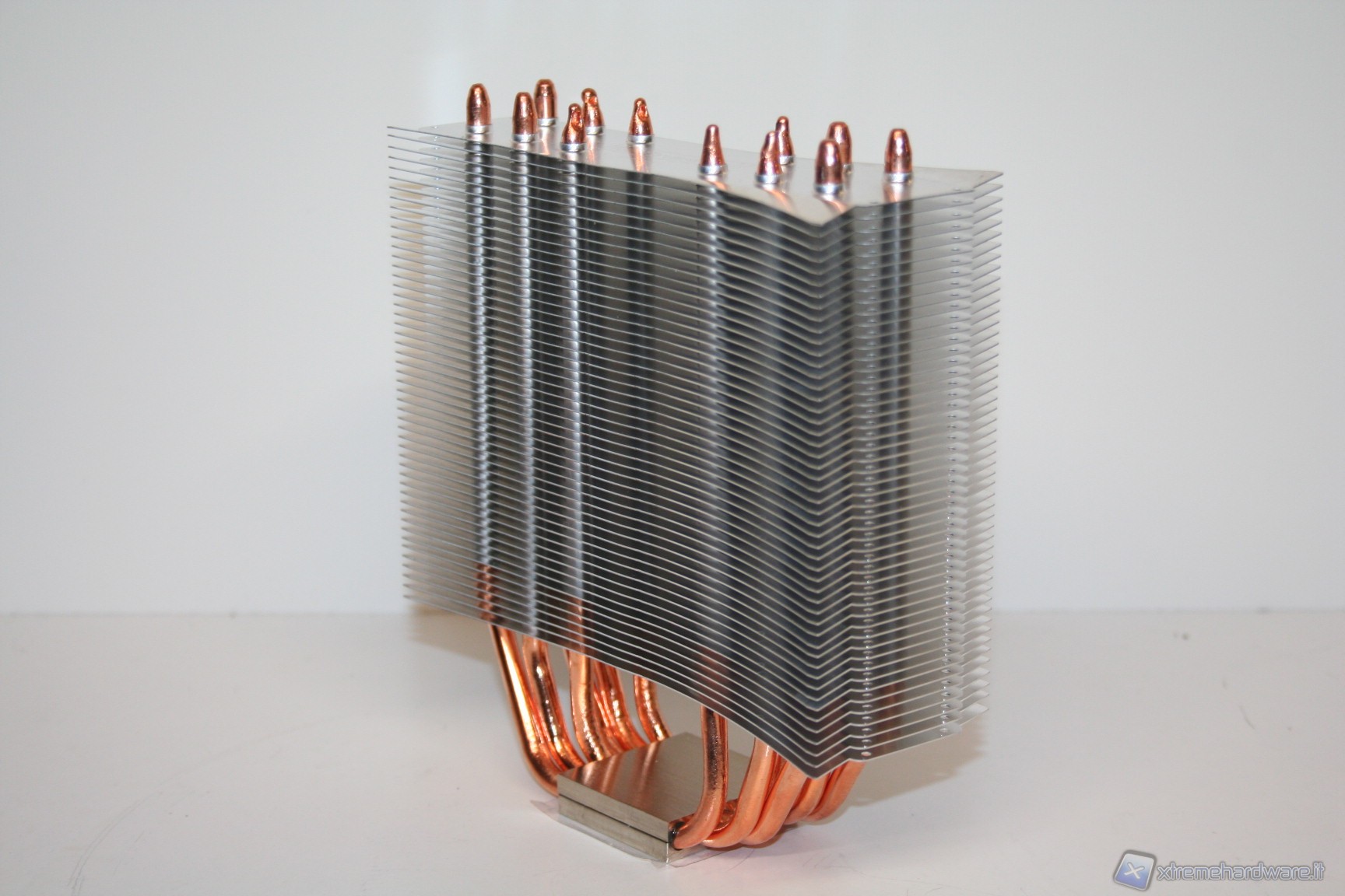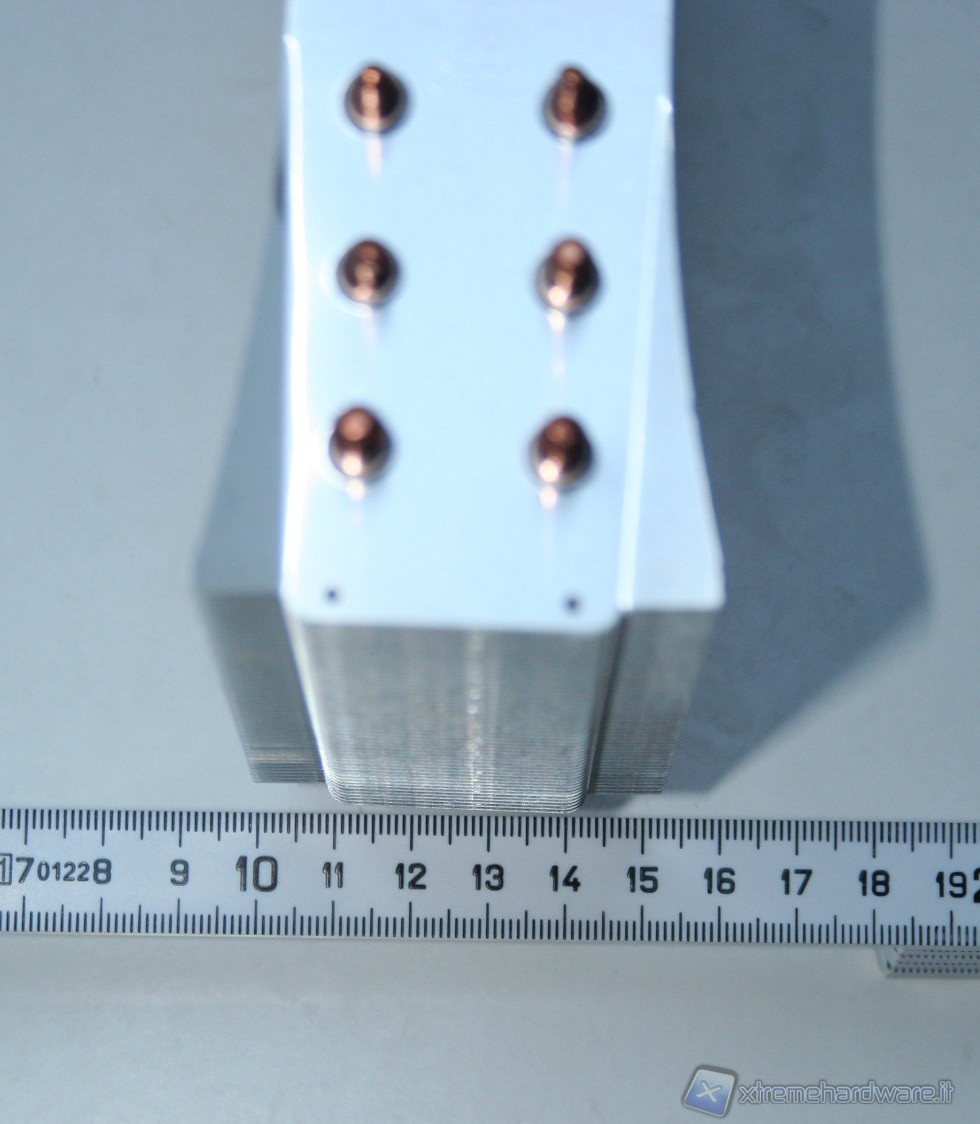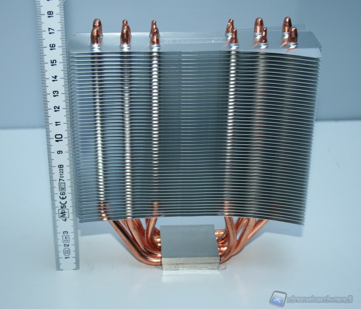 Ci sono 50 alette in alluminio e 6 heat pipes in rame con diametro di 6mm, con struttura ad “U”. La base è in rame con finitura al nichel. Rispetto al TRUE Spirit 120 guadagna due heat pipes, il che significa che otterremo temperature leggermente migliori, anche per via delle dimensioni complessive di poco superiori. E’ ottima la saldatura delle alette sulle heat pipes e la finitura della base è di ottimo livello. Anche l’assemblaggio è molto buono e permette di conferire un’ottima zona di contatto tra la base e le heat pipes saldate su di essa.