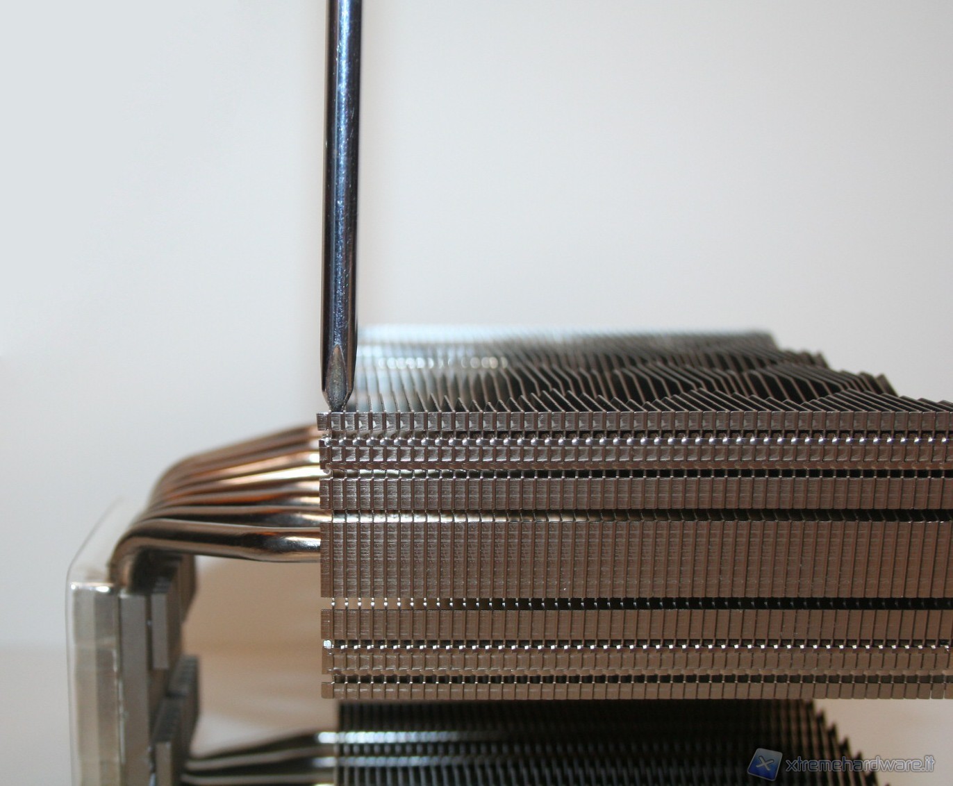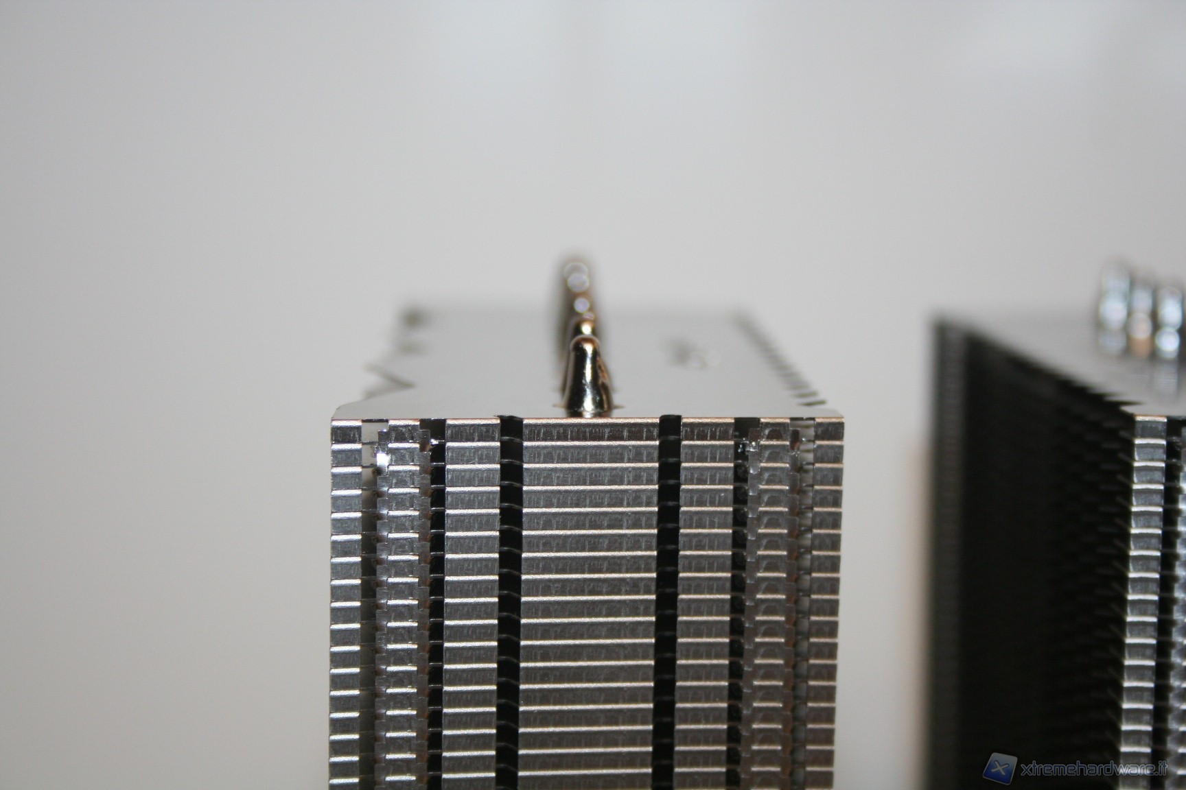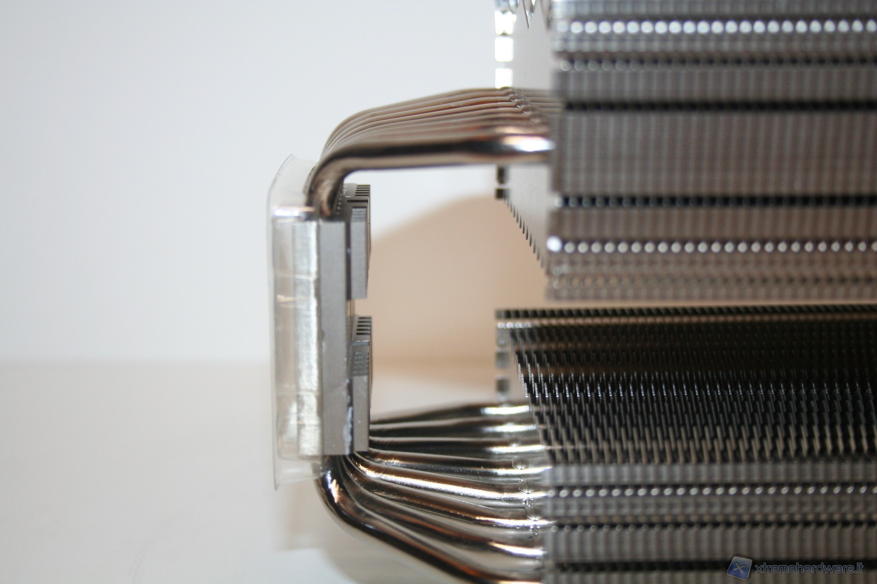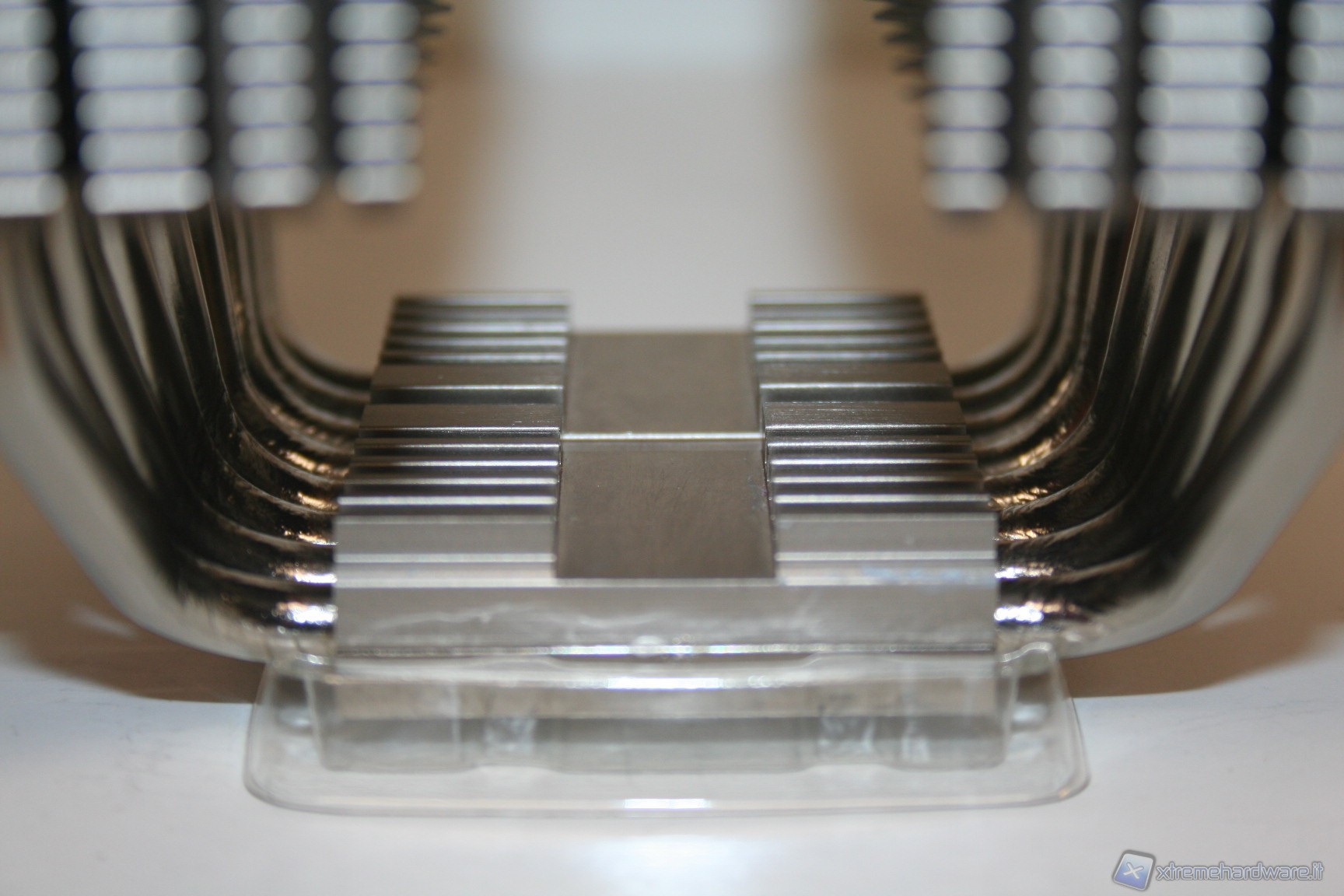 Le alette purtroppo non sono saldate alle heatpipes, sebbene ci sia un’elevata solidità strutturale, derivante anche dalla chiusura laterale dell’unità; ottima anche la qualità delle heatpipe stesse, ed anche qui è stato aggiunto del nickel, per evitare fenomeni di ossidazione nel tempo. La finitura è semplicemente ottima, come le impressioni generali. Vogliamo farvi notare anche la finitura terminale delle heatpipes, che sebbene non presenti un cappuccio terminale come altre marche, è nickelato e di eccellente fattura. Nella parte bassa inoltre potrete notare la presenza di un rudimentale dissipatore passivo, e una depressione centrale che servirà all’atto del montaggio.