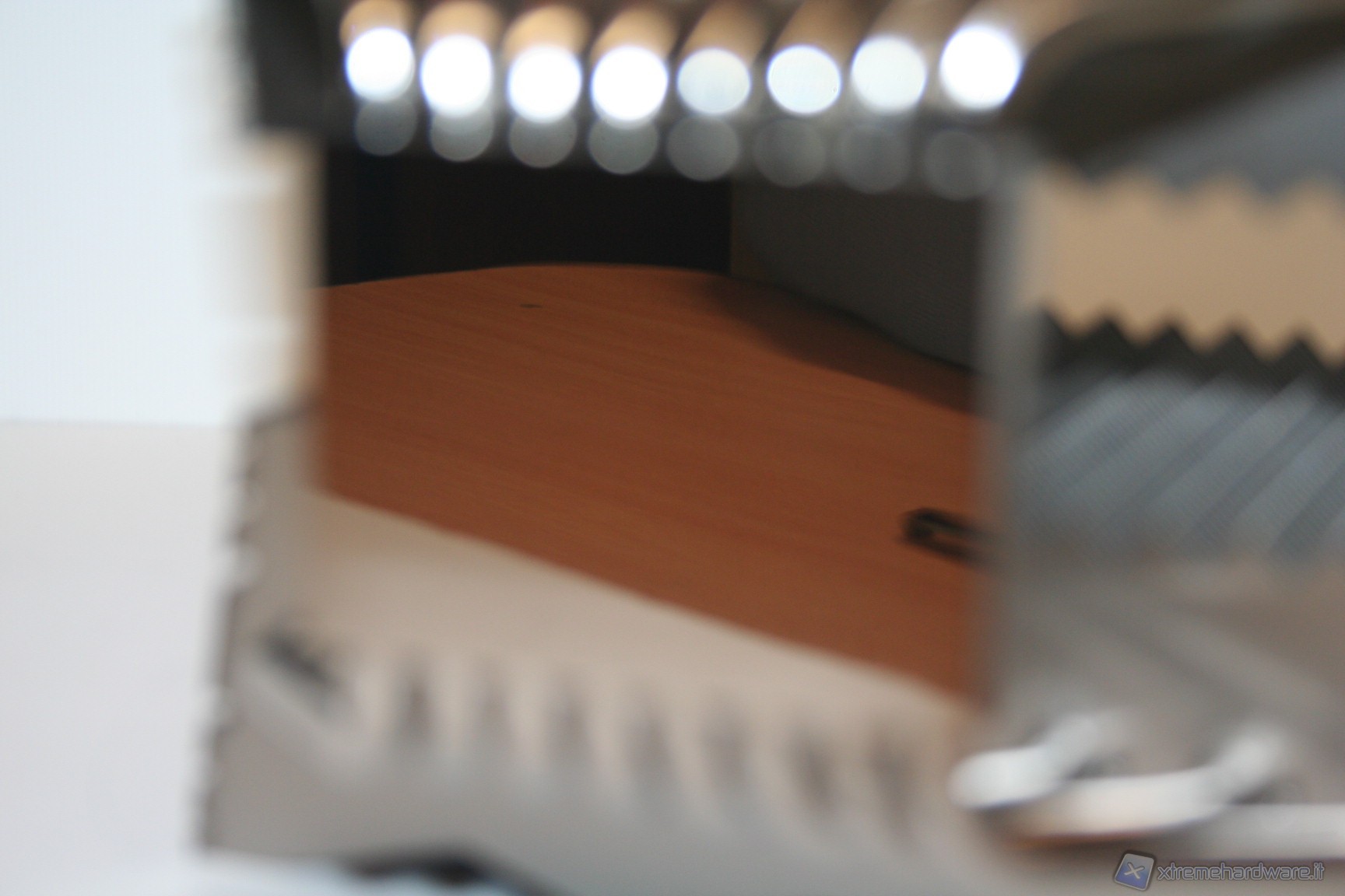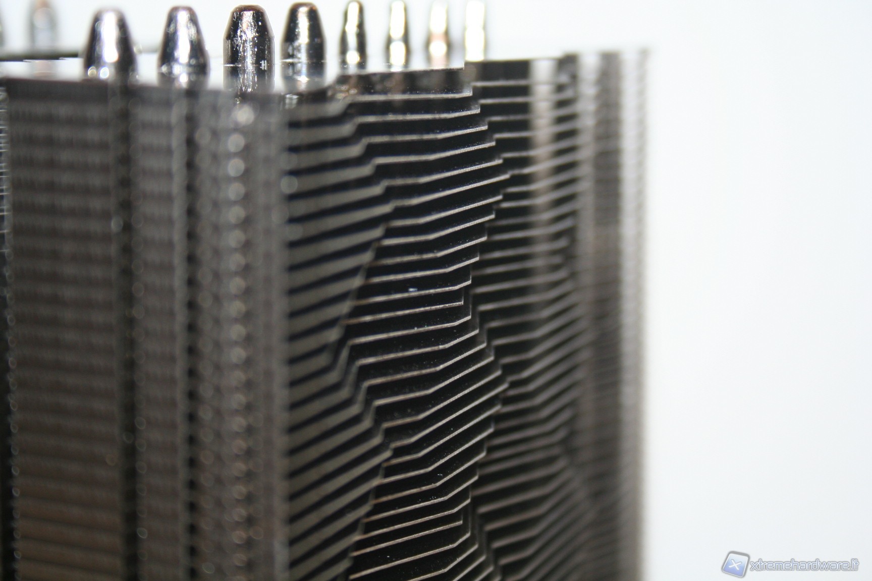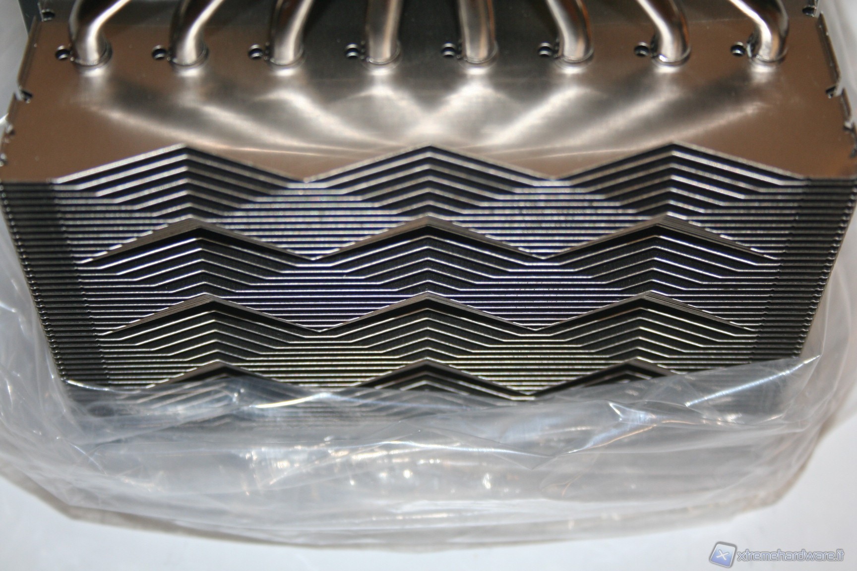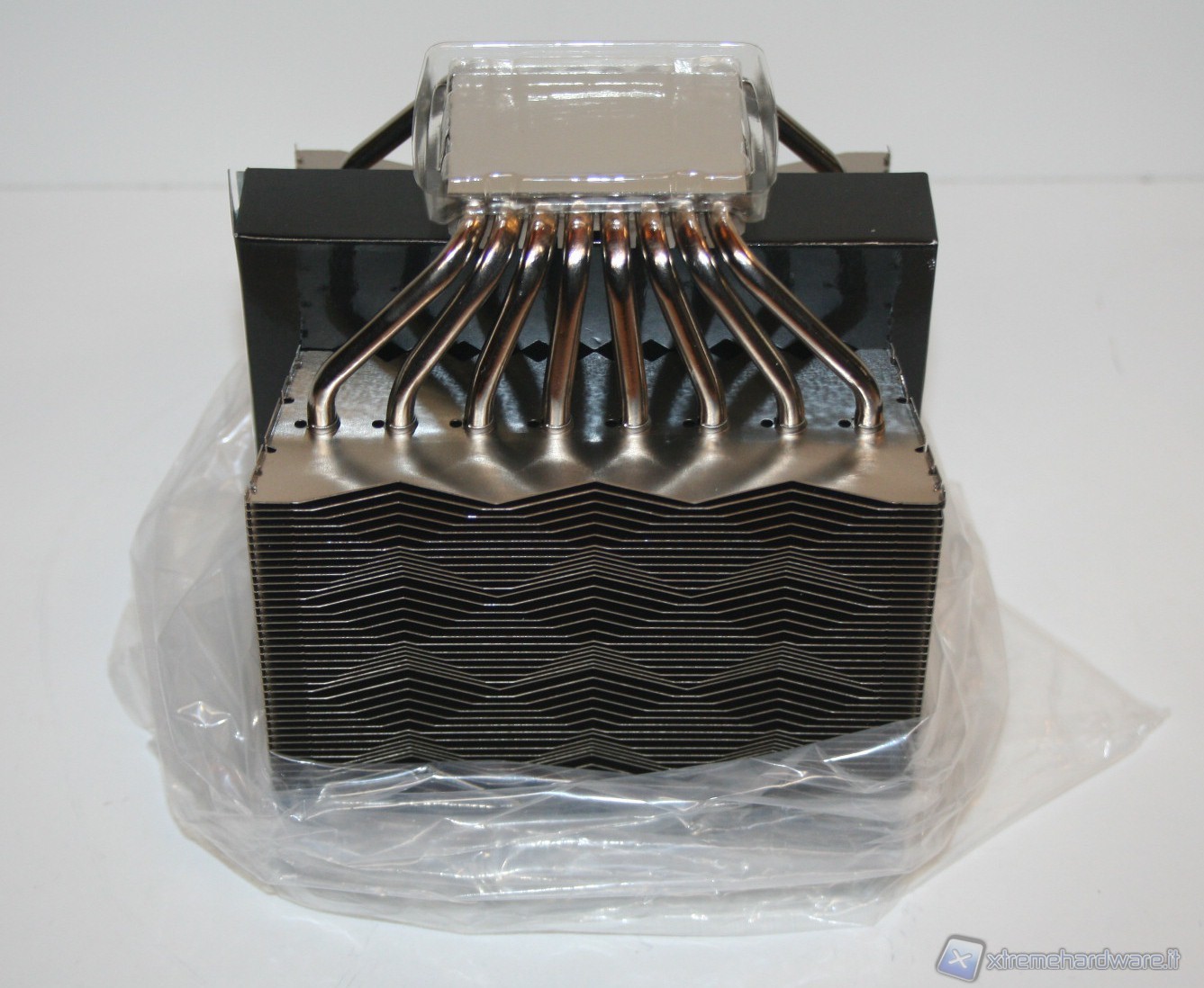 Le alette purtroppo non sono saldate alle heatpipes, sebbene ci sia un’elevata solidità strutturale, derivante anche dalla chiusura laterale dell’unità; ottima anche la qualità delle heatpipe stesse, ed anche qui è stato aggiunto del nickel, per evitare fenomeni di ossidazione nel tempo. La finitura è semplicemente ottima, come le impressioni generali. Vogliamo farvi notare anche la finitura terminale delle heatpipes, che sebbene non presenti un cappuccio terminale come altre marche, è nickelato e di eccellente fattura. Nella parte bassa inoltre potrete notare la presenza di un rudimentale dissipatore passivo, e una depressione centrale che servirà all’atto del montaggio.