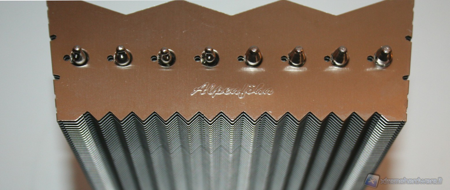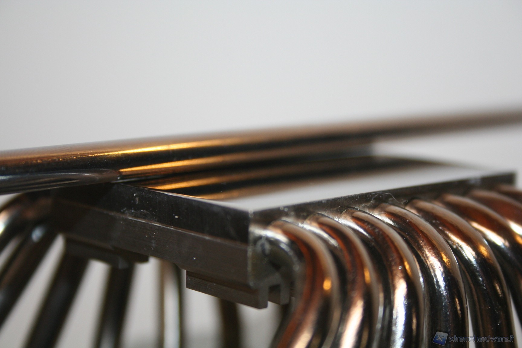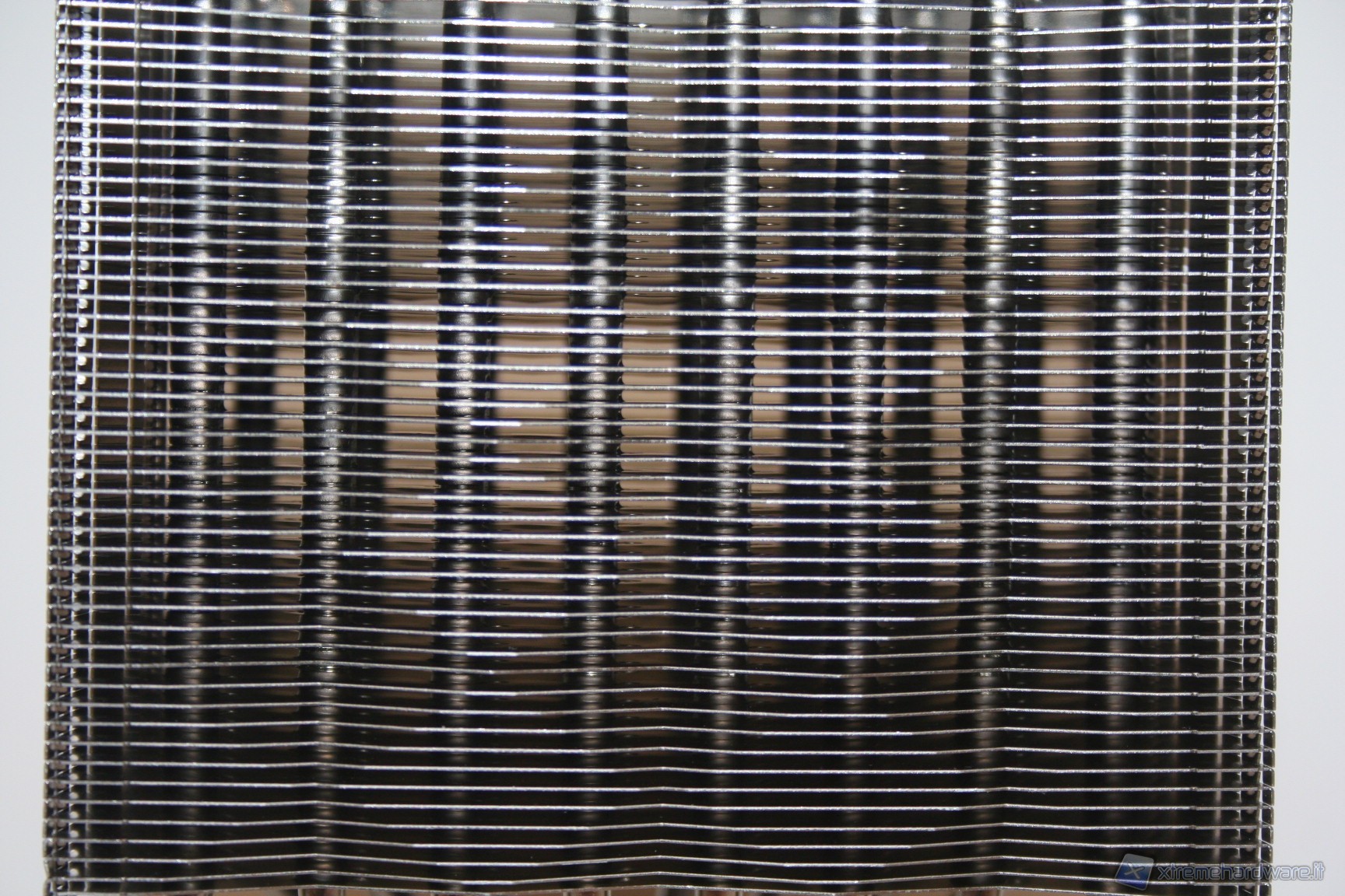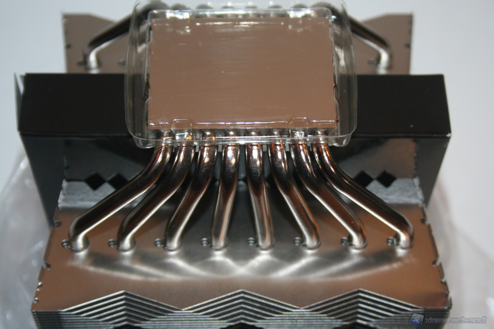 Le alette purtroppo non sono saldate alle heatpipes, sebbene ci sia un’elevata solidità strutturale, derivante anche dalla chiusura laterale dell’unità; ottima anche la qualità delle heatpipe stesse, ed anche qui è stato aggiunto del nickel, per evitare fenomeni di ossidazione nel tempo. La finitura è semplicemente ottima, come le impressioni generali. Vogliamo farvi notare anche la finitura terminale delle heatpipes, che sebbene non presenti un cappuccio terminale come altre marche, è nickelato e di eccellente fattura. Nella parte bassa inoltre potrete notare la presenza di un rudimentale dissipatore passivo, e una depressione centrale che servirà all’atto del montaggio.