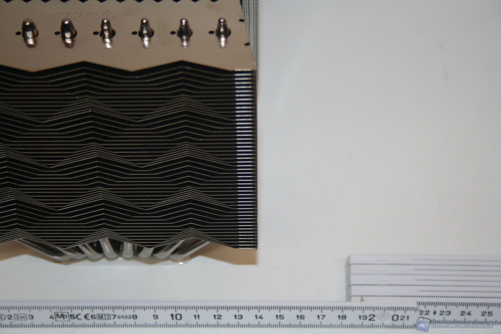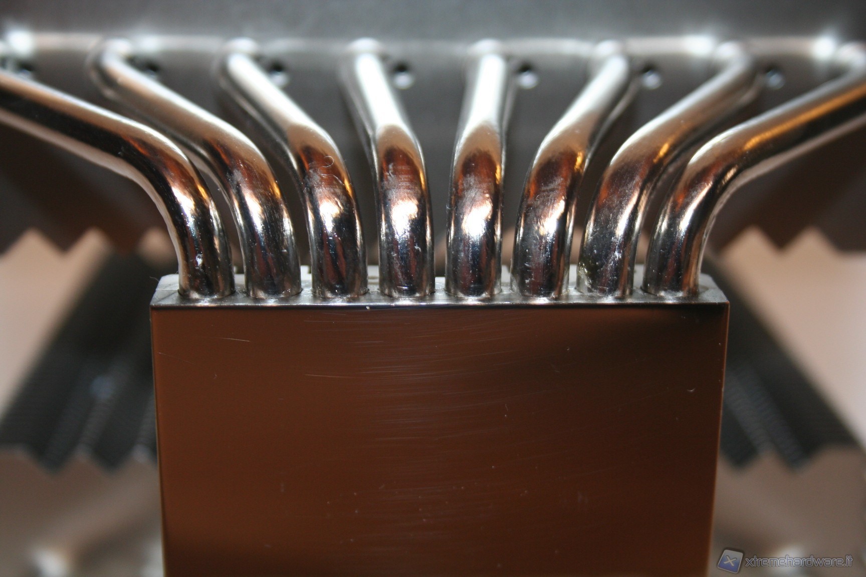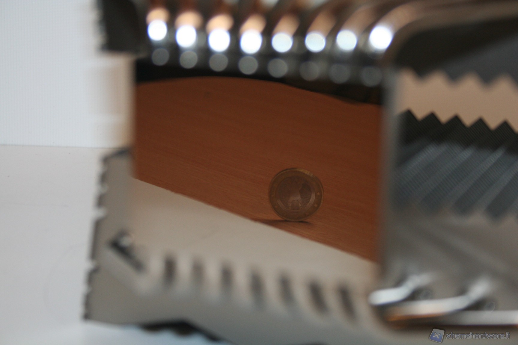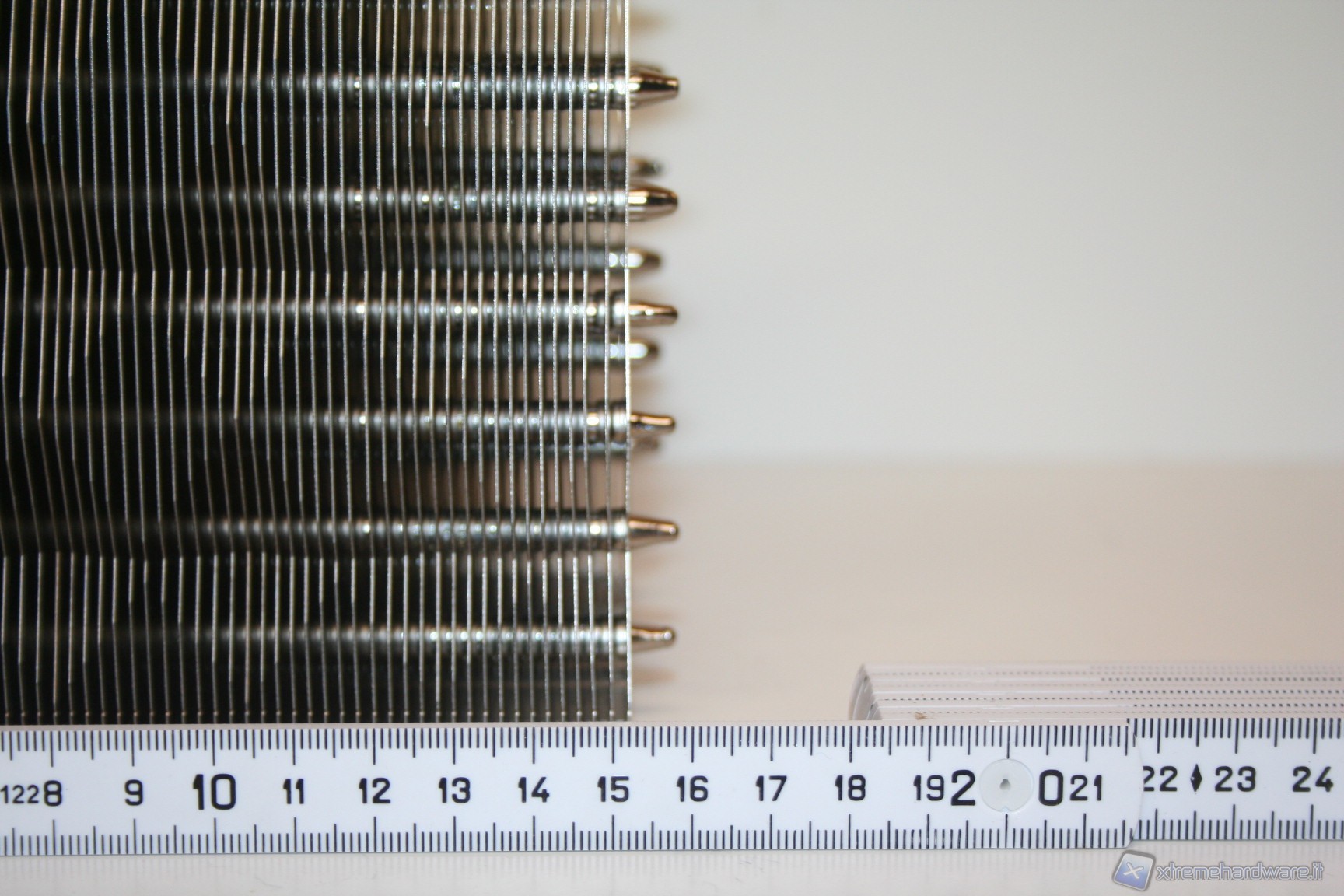 Le alette purtroppo non sono saldate alle heatpipes, sebbene ci sia un’elevata solidità strutturale, derivante anche dalla chiusura laterale dell’unità; ottima anche la qualità delle heatpipe stesse, ed anche qui è stato aggiunto del nickel, per evitare fenomeni di ossidazione nel tempo. La finitura è semplicemente ottima, come le impressioni generali. Vogliamo farvi notare anche la finitura terminale delle heatpipes, che sebbene non presenti un cappuccio terminale come altre marche, è nickelato e di eccellente fattura. Nella parte bassa inoltre potrete notare la presenza di un rudimentale dissipatore passivo, e una depressione centrale che servirà all’atto del montaggio.