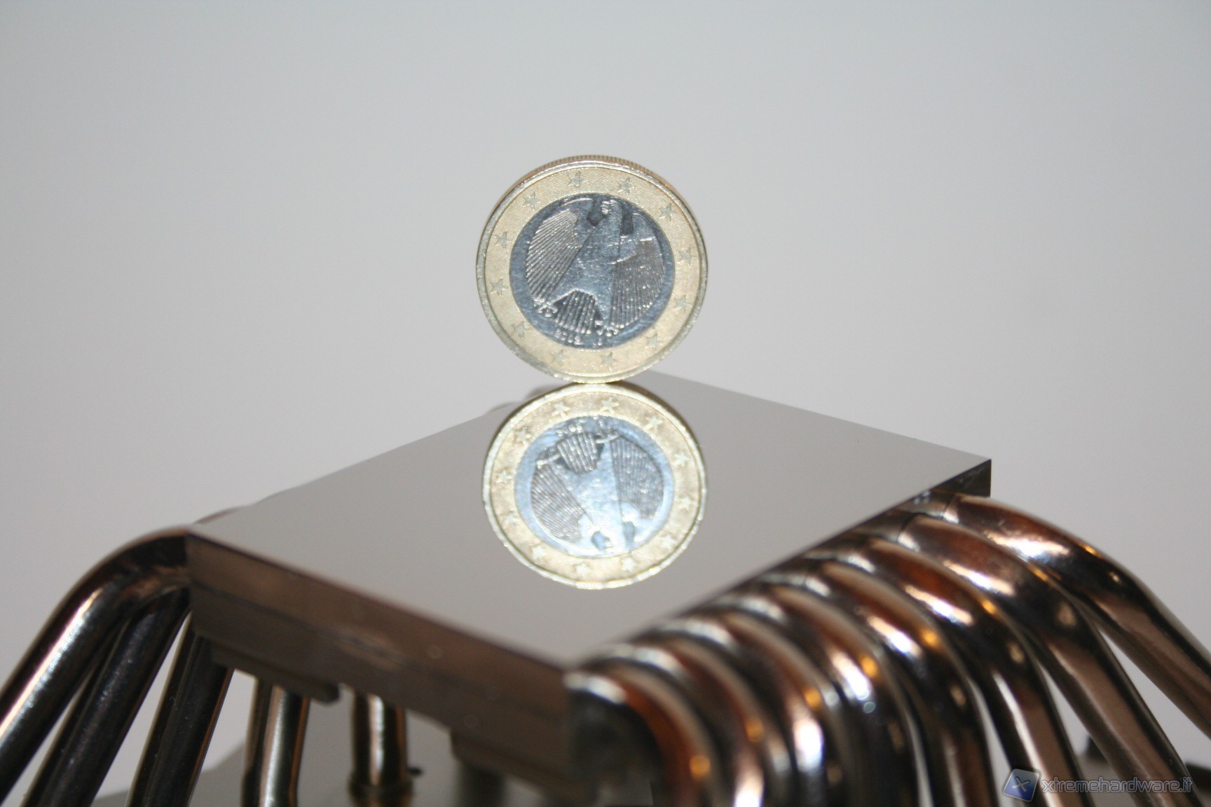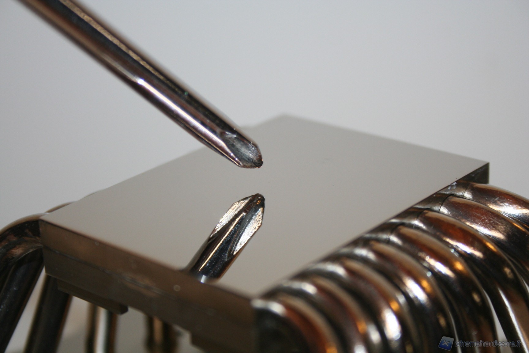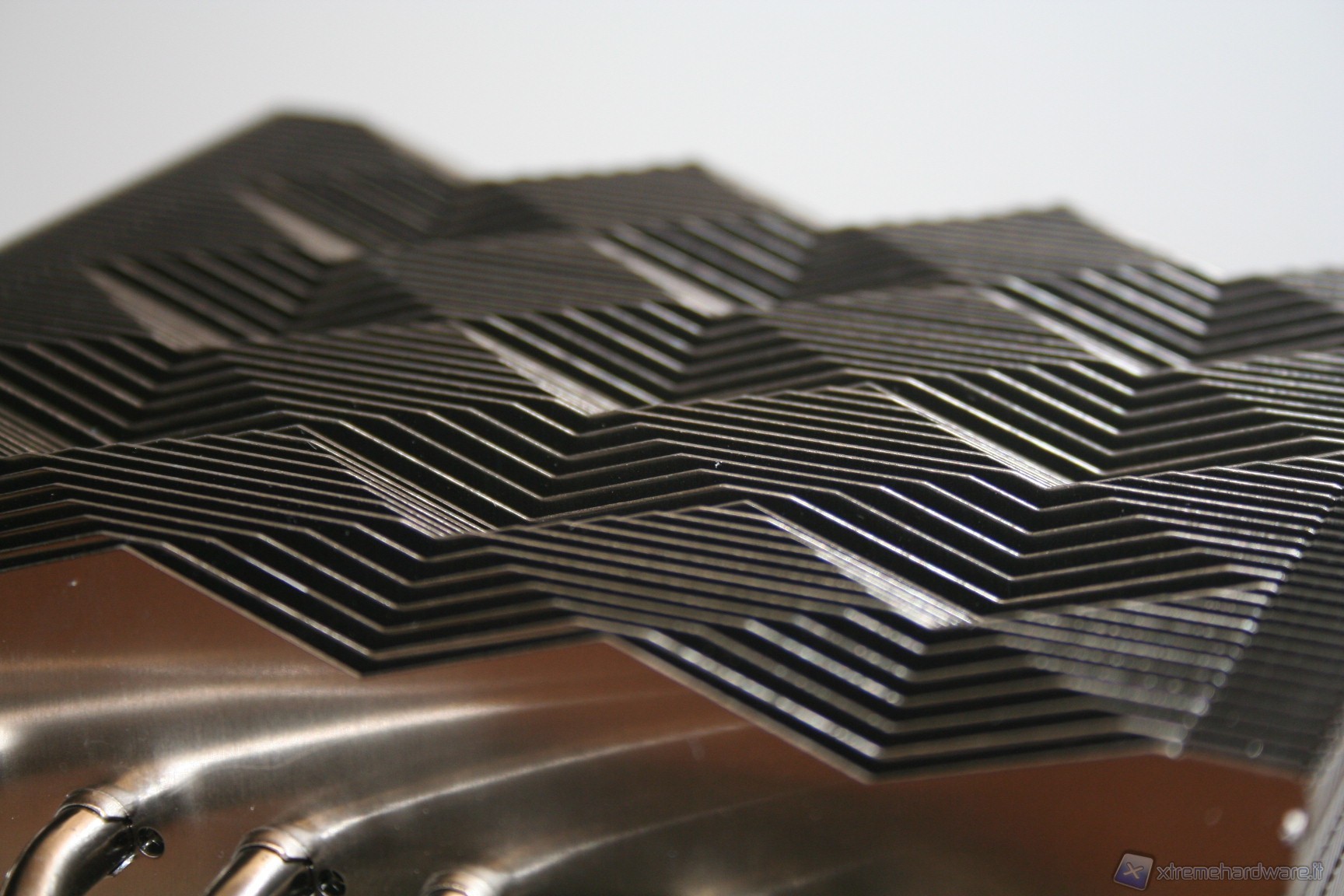 La struttura della base è particolarissima e diversamente da altre soluzioni della concorrenza è stato deciso di non utilizzare le heatpipes a diretto contatto, che in linea teorica dovrebbero permettere una dissipazione termica migliore. Il problema è che i moderni sistemi difficilmente ci riescono, quindi in generale le aziende preferiscono adottare uno standard classico con heatpipes inserite all’interno della base. Quest’ultima è lappata a specchio ed è perfettamente lavorata, non presentando rugosità o deformazioni. Non è però planare, presenta una convessità simile alle soluzioni Thermalright, che generalmente detengono il primato prestazionale per categoria; la cosa strana è che forse tale scelta è stata fatta in modo esagerato, in quanto nella nostra sessione di test abbiamo avuto difficoltà ad ottenere un’ottima impronta, con la conseguenza che c’è stato un maggior lavoro delle heatpipe nella loro parte centrale. Problema relativo, in quanto vengono utilizzate quasi tutte in lunghezza, ma che comunque poteva essere affrontato diversamente.