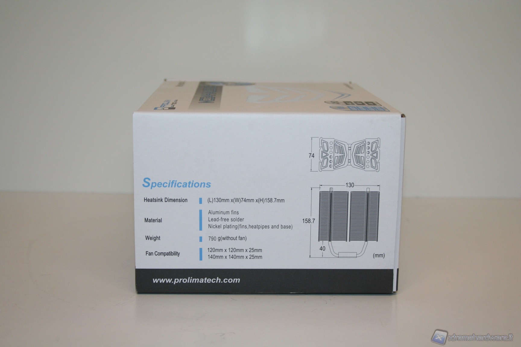 Precisiamo che non sono presenti ventole: i dissipatori Prolimatech ne sono sempre sprovvisti. Ciò permette all’utente di effettuare la scelta finale, bilanciando a piacimento prestazioni, rumorosità, estetica e spesa finale. Riteniamo comunque che, data l’ottima qualità costruttiva delle Blue Vortex, Prolimatech potrebbe anche inserirle direttamente nel bundle; vogliamo far notare, inoltre, che Prolimatech possiede delle ventole molto particolari, le Prolimatech Aluminum da 140mm, che abbiamo recensito tempo fa (1), una soluzione che è stata capace di abbassare la temperatura di 7 gradi sotto carico a 4GHz di frequenza, rispetto ad una ventola da 12cm Cooler Master. Caseking offre a catalogo diversi kit comprensivi di una o due ventole, con ottimi sconti sul prezzo finale.