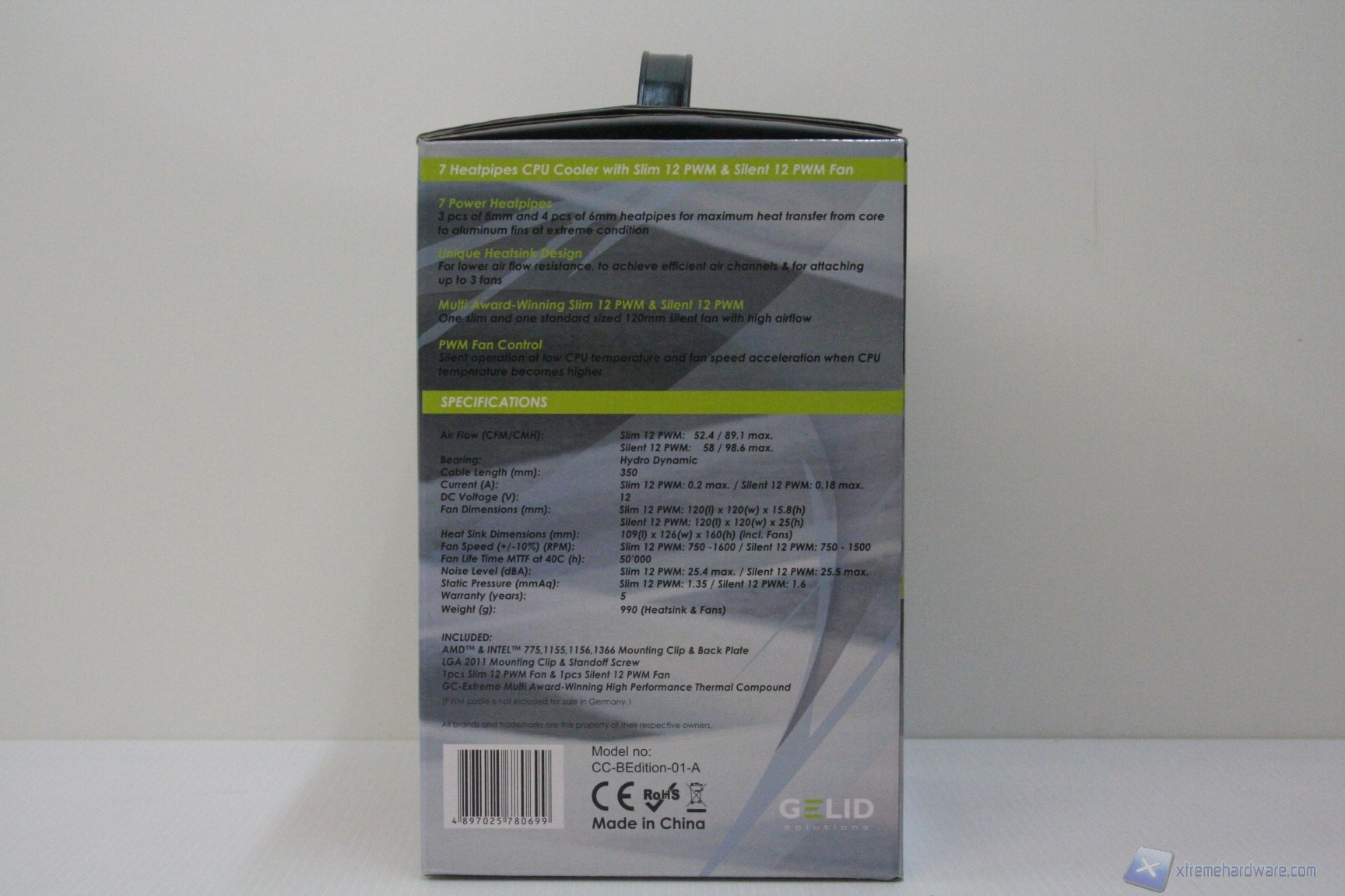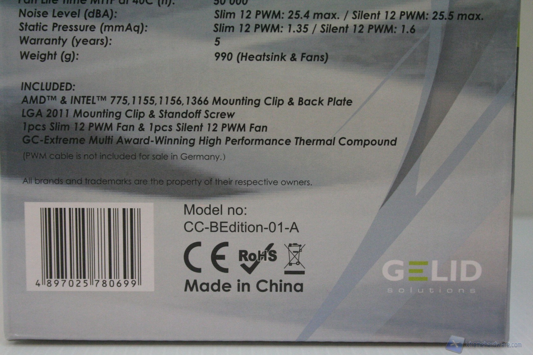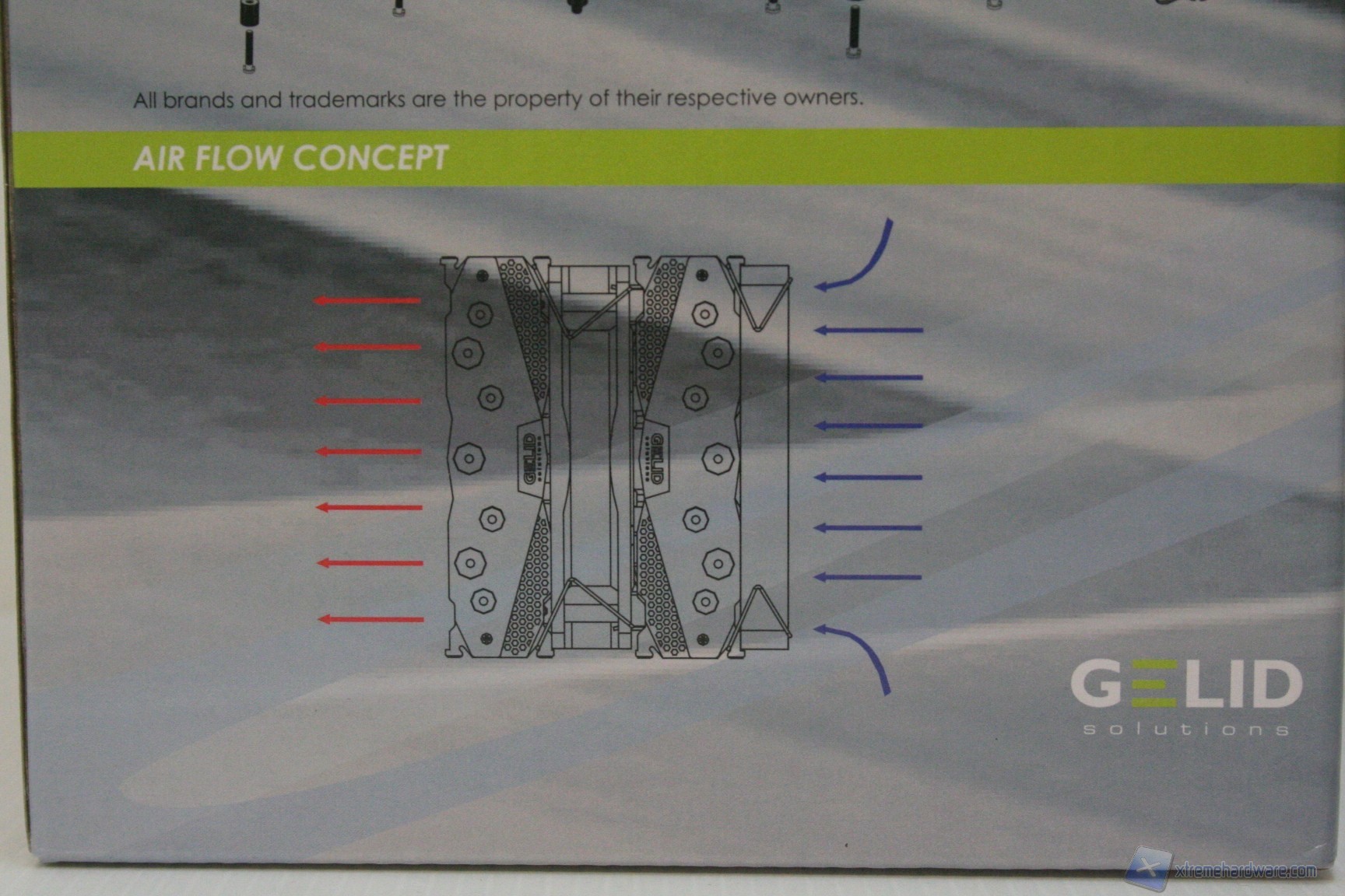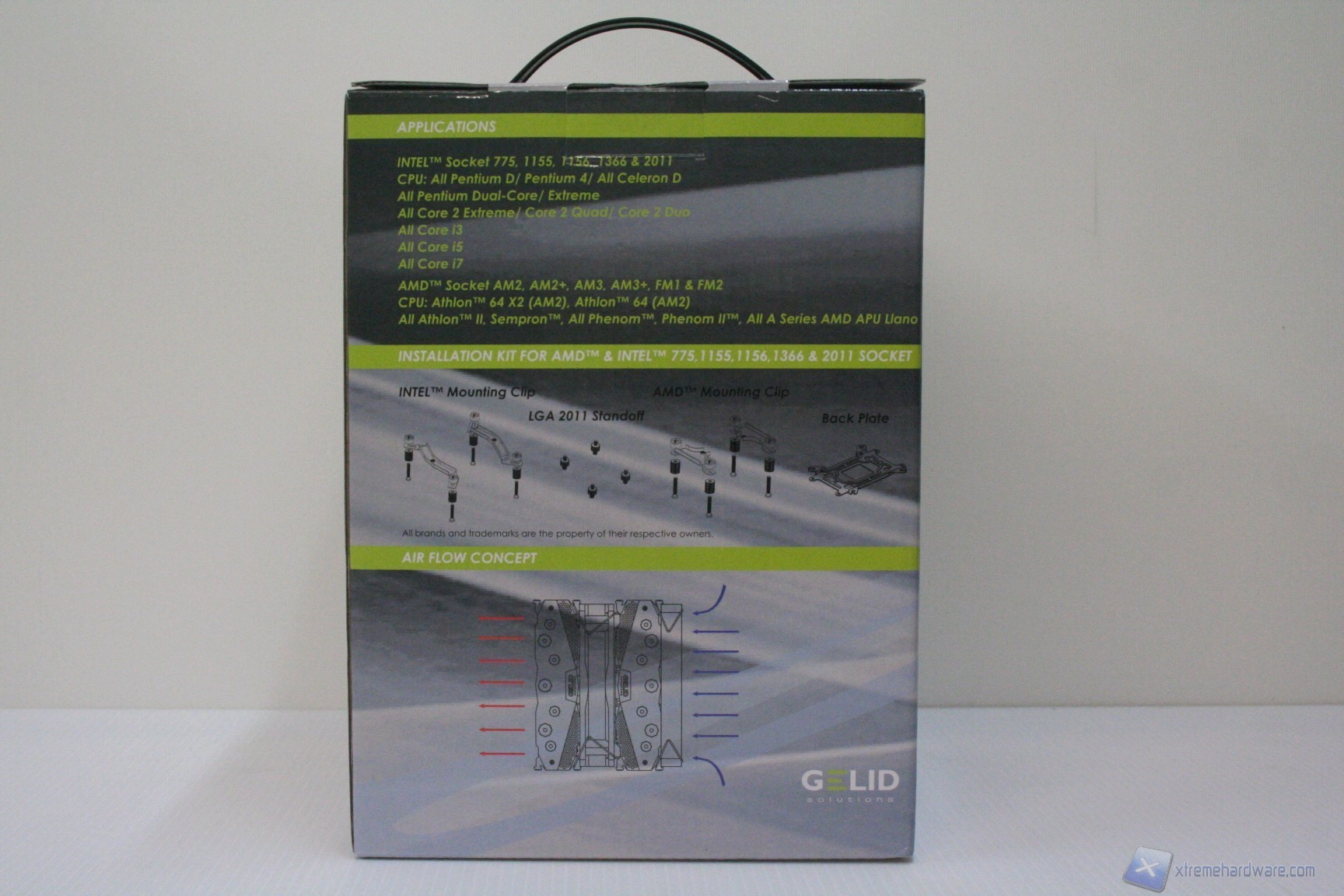 Il confezionamento esterno, similmente alle passate soluzioni Gelid, è molto vivace ed è stato curato moltissimo nell’esposizione delle informazioni. L’imballo interno è eccellente e notiamo fin da subito che è stata riposta molta cura nella presentazione, interna ed esterna, di questo prodotto. Il manuale è di buona qualità, anche se forse non facile da comprendere. Il bundle è ottimo in quanto è presente anche un tubetto di pasta termica, di eccellente qualità (GC-Extreme), oltre a due staffe per il montaggio della terza ventola posteriore.