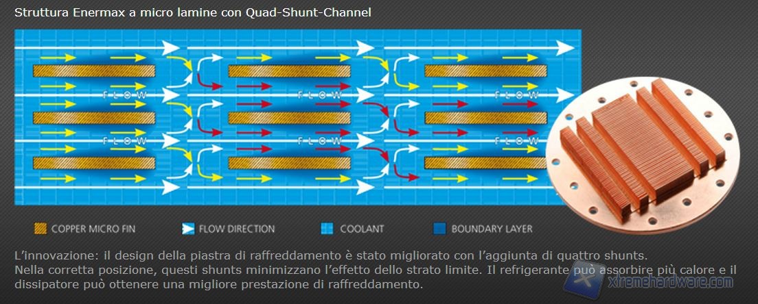 In seguito ad un attento studio di fluidodinamica, Enermax ha deciso, di introdurre delle scanalature ortogonali, ai microcanali del waterblock, al fine di migliorare il flusso attraverso lo stesso e di conseguenza lo scambio termico con la CPU.