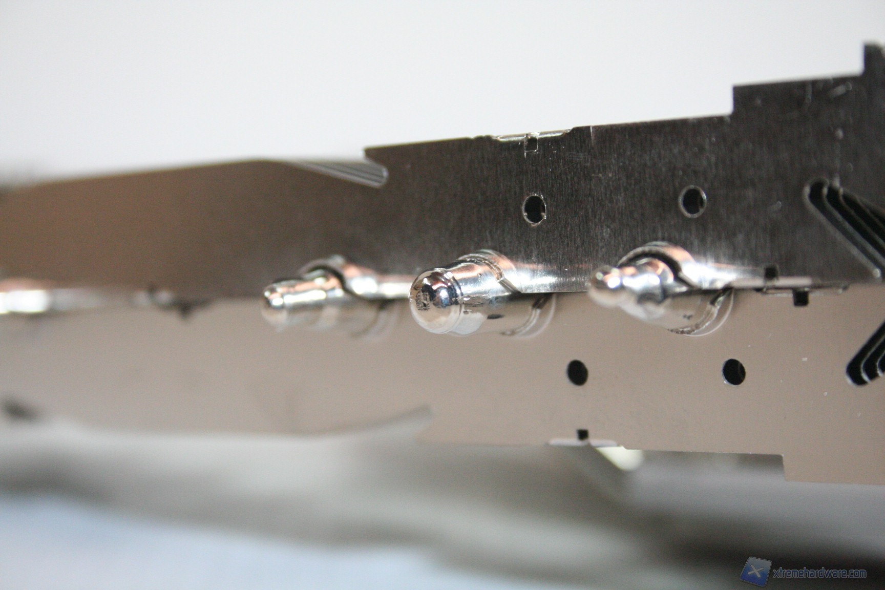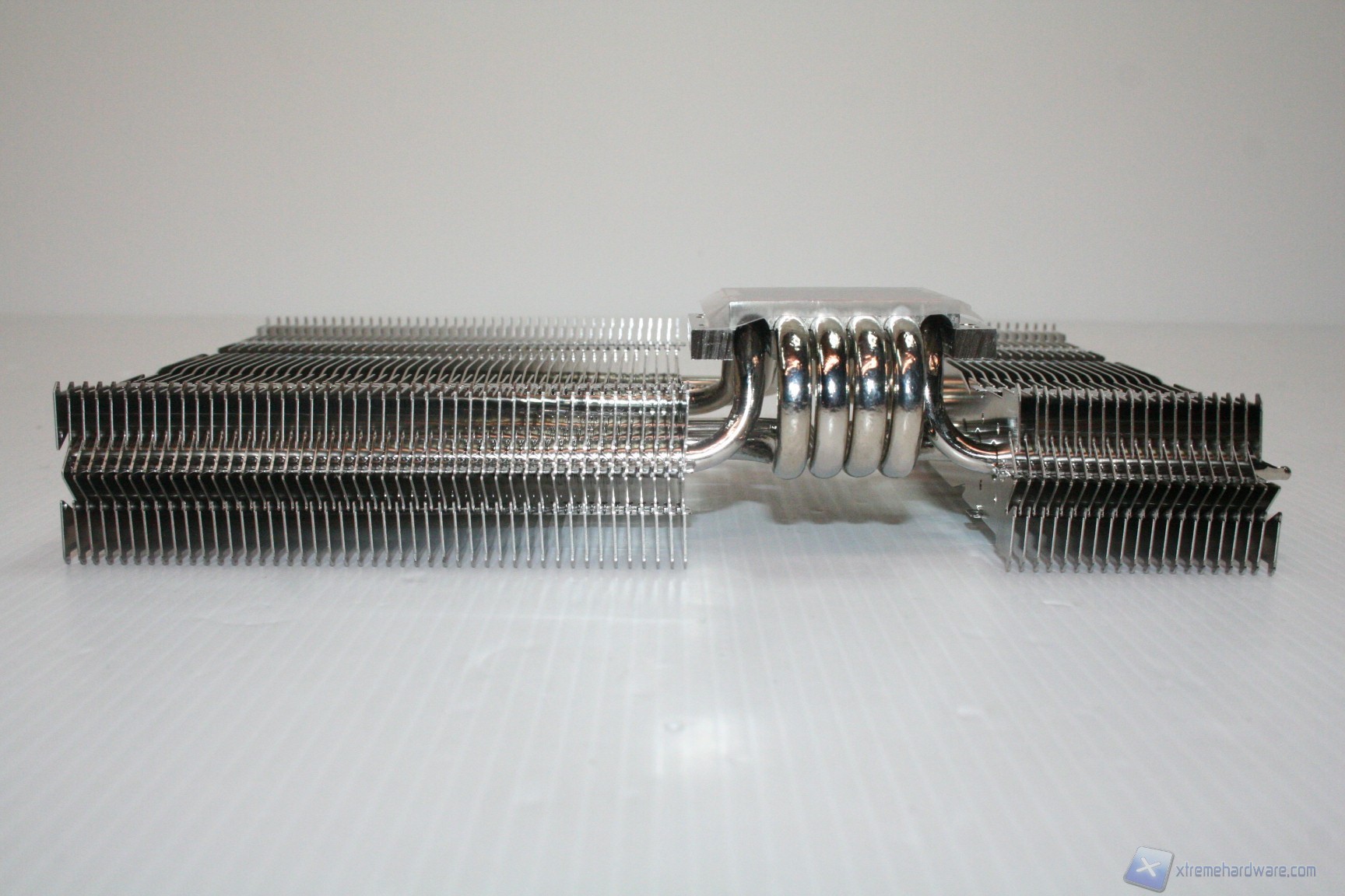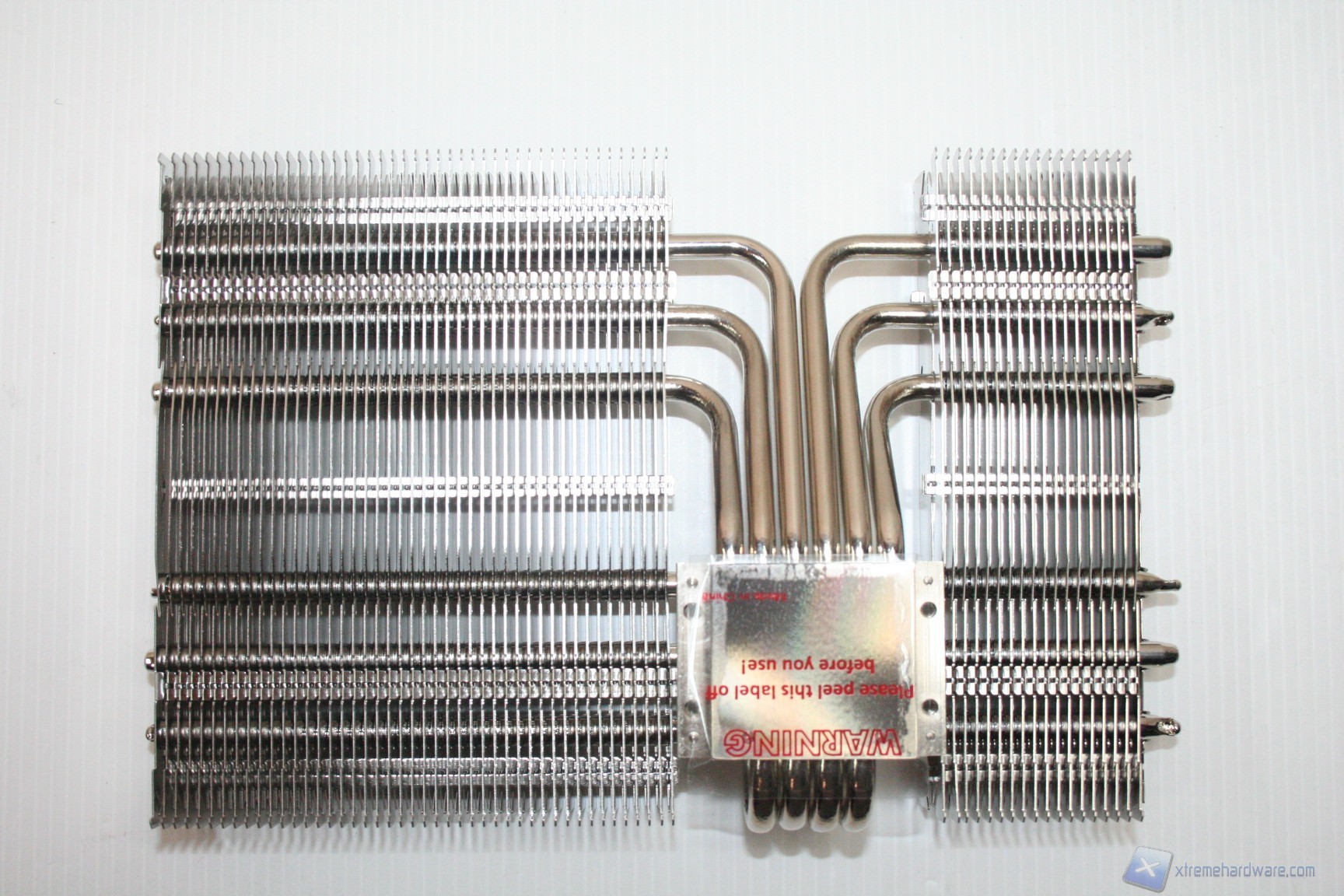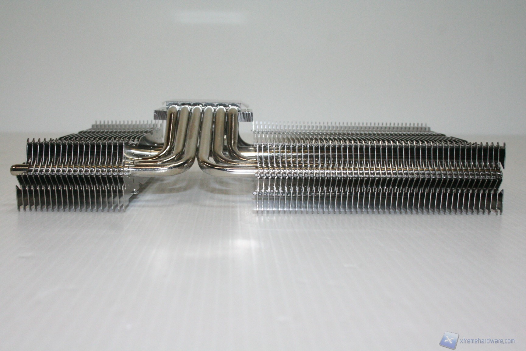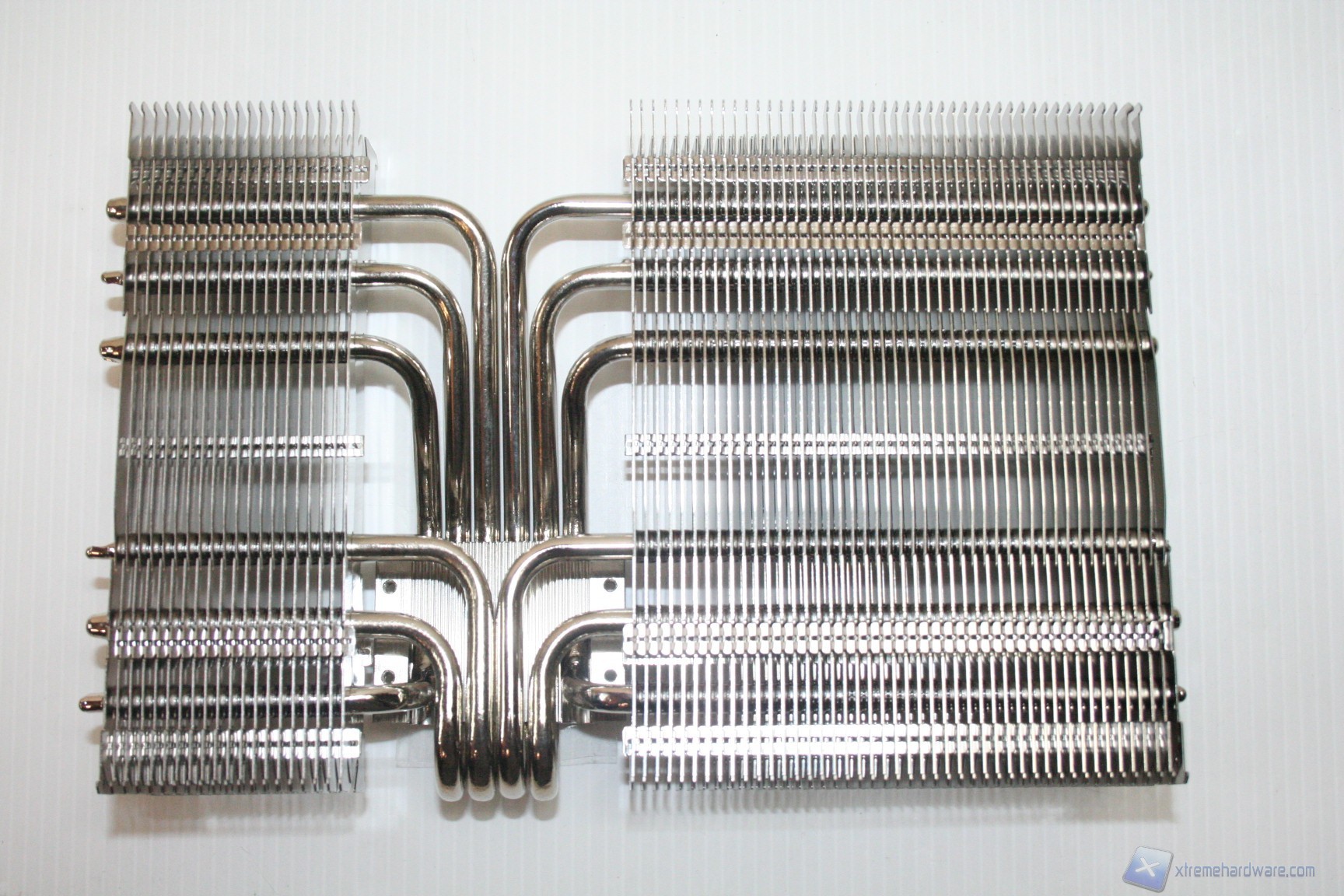 La lavorazione delle alette è esemplare, con spessore di 0.3mm e punzonate, quindi sarà stabile ma deformabile se necessario, qualora servisse di adattarlo a componenti sul PCB non standard (DREMEL required !). Le heatpipes, ben 6 da 6 mm, sono nickelate e presentano una scudatura terminale alternata. Il design è asimmetrico, con la parte sinistra di dimensioni inferiori per questioni di compatibilità. La parte centrale non prevede l’utilizzo di alette ma possiamo ammirare le 6 heatpipes che attraversano la base del dissipatore, con una conformazione ad “U” per massimizzare lo scambio termico.