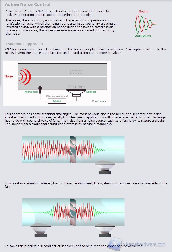 Oltre a questo, sempre dal medesimo portale, nella fiera informatica di questi giorni a Taipei (Computex 2013) abbiamo appreso che sta andando avanti il progetto di collaborazione tra Noctua e Rotosub, per la realizzazione di un sistema di ventilazione che faccia del proprio vanto la possibilità di ammorbidire il profilo di emissione acustico tramite l’adozione di un sistema di cancellazione del rumore, che si basa sul fenomeno dell’Active Noise Cancellation (ANC):
