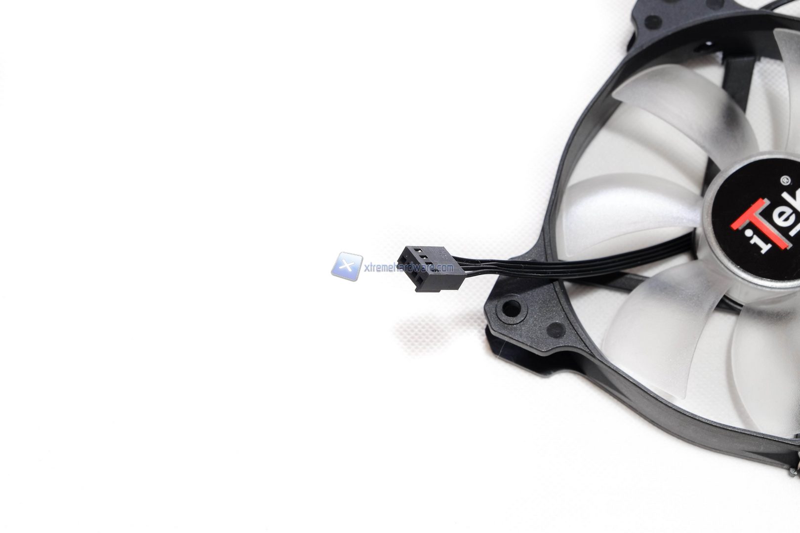 Prima di passare alla fase di montaggio analizziamo velocemente le due ventole incluse nel bundle. Con questo dissipatore vengono fornite due ventole marchiate Itek da 120 mm PWM e dotate di 4 led rossi. Troveremo il frame di colore Nero e le 7 pale di colore trasparente. Non manca un adesivo Itek nella parte frontale. Il design è classico ma, almeno dai dati di fabbrica, le prestazioni si attestano su buon livelli, ossia un flusso d’aria di 98 CFM e 3 mmH²O di pressione statica a 12V. Sono ventole a 12Velocità massima di circa 2500 RPM e una portata di 71 CFM.