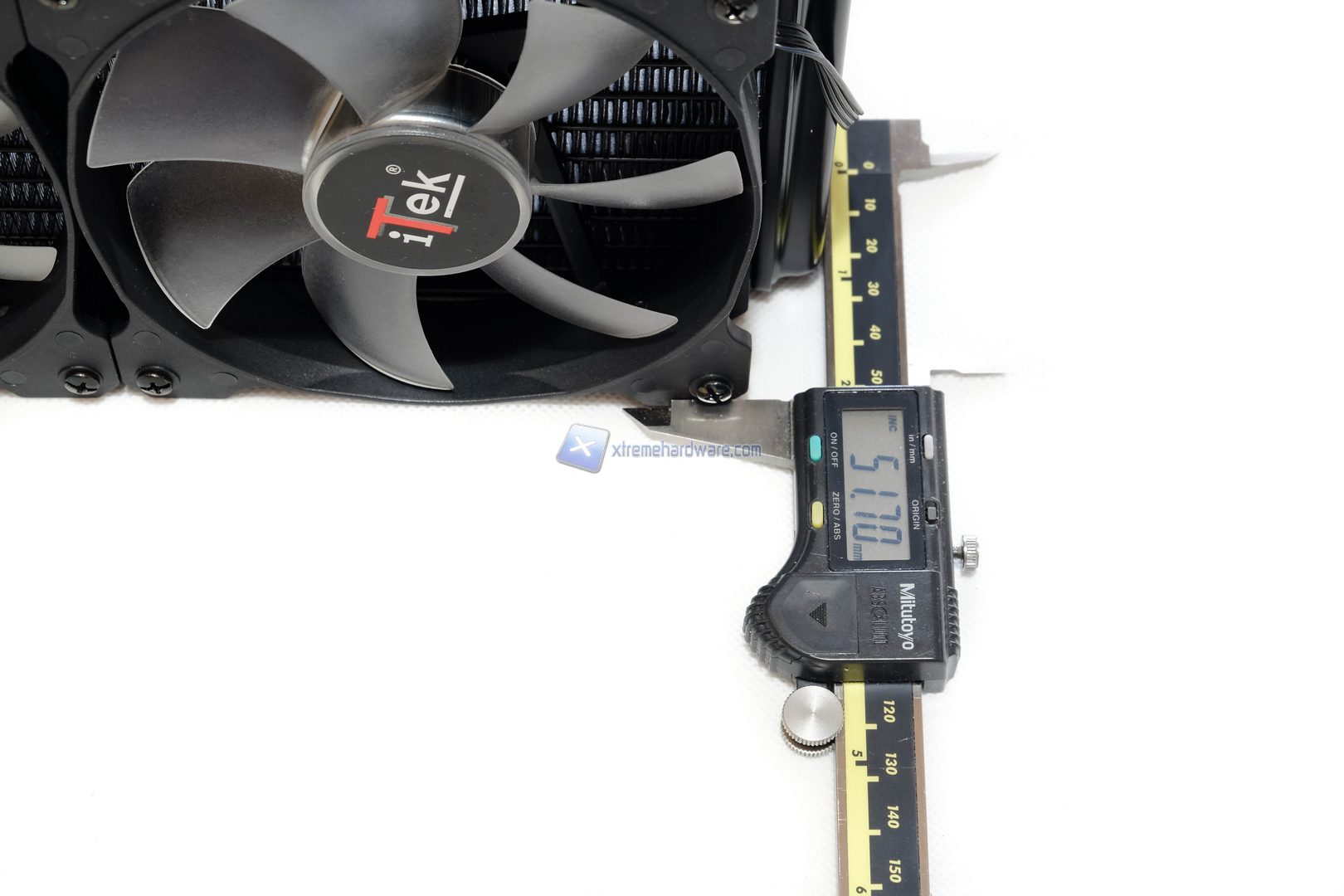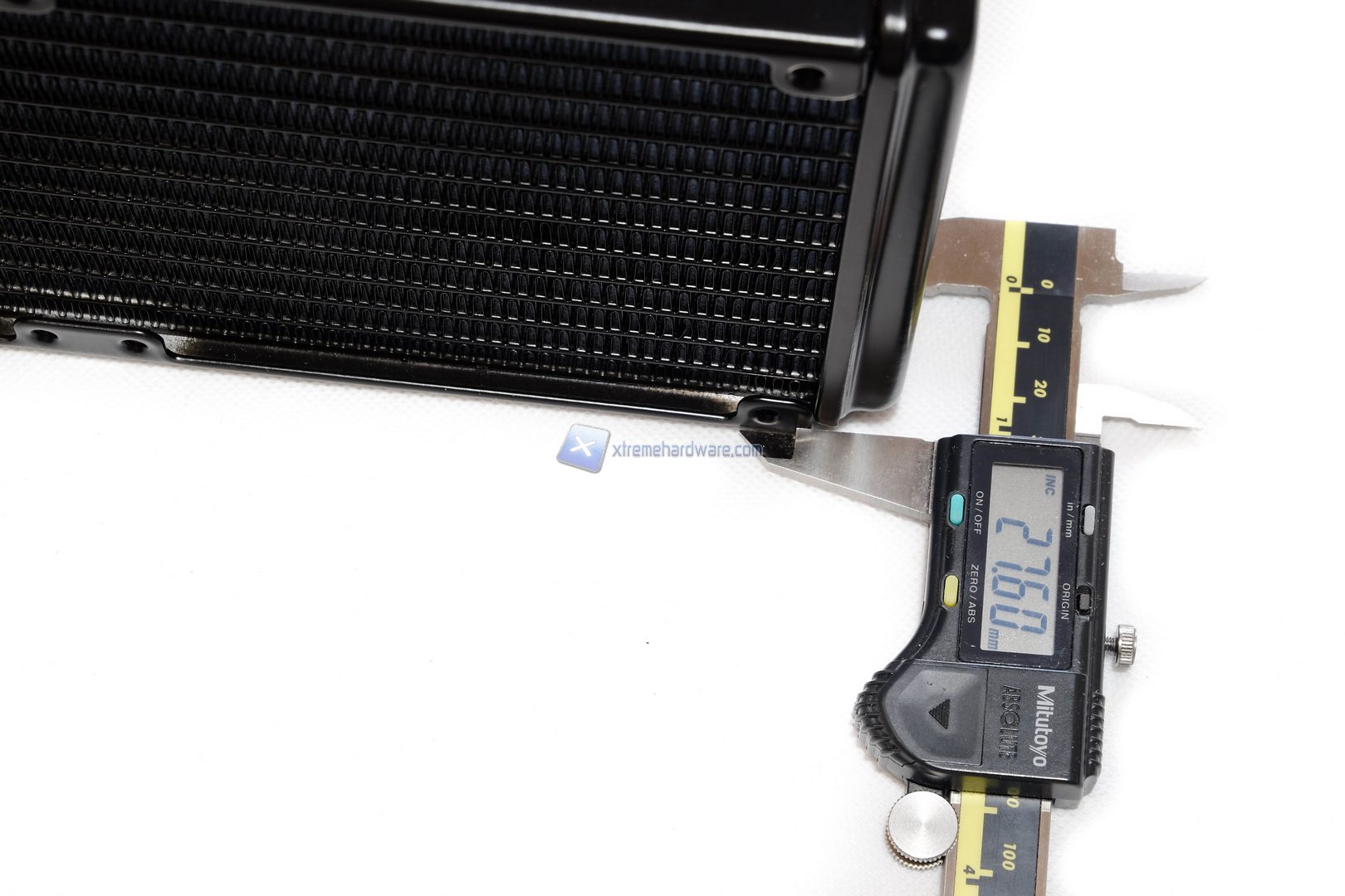 Il design è classico, contraddistinto da una colorazione completamente nera. Iniziamo la nostra analisi partendo dal radiatore. Quest’ultimo è realizzata completamente in alluminio e presenta delle dimensioni maggiori rispetto a più economici “slim”, così da migliorare ovviamente le prestazioni. Nel dettaglio abbiamo 273 x 120 mm con uno spessore di ben 27 mm. Volendo trovare un punto debole a tale componente non possiamo non segnalare la mancanza di supporti laterali con finecorsa, quindi dovremmo prestare molta attenzione quando fissiamo il radiatore con le viti al case, poiché stringendo troppo andremo a piegare le lamelle sottostanti. Le lamelle in alluminio, adibite a dissipare nell’aria il calore prodotto dalla CPU, sono poco distanziate tra di loro, con un valore FPI di circa 20, caratteristica che rende tale dissipatore maggiormente indicato per ventole ad elevata pressione statica.
