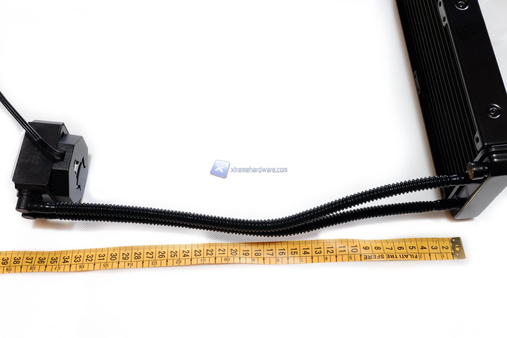 Nella parte inferiore del radiatore troviamo installati i due tubi in FEP e una vite per svuotare il loop in caso ce ne fosse necessità. I lati sono completamente planari e non presentano alcuna peculiarità. I tubi come abbiamo detto sono realizzati in FEP con diametro di 10 mm, meno belli rispetto a quelli in gomma ma sicuramente molto meno rigidi e di conseguenza più facili da adattare all’interno del nostro case. Infine la loro lunghezza è di circa 35 cm, davvero lunghi.