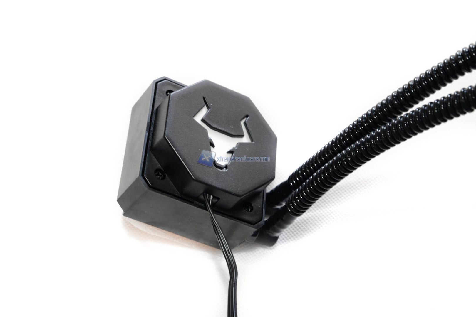 Il waterblock non presenta connettori particolari, come ad esempio porte USB per eventuali software di gestione, infatti l’unico cavo presente è quello di alimentazione, composto da un connettore sata per il power ed un 3-pin per leggere la velocità di rotazione della pompa, che si assesta sui 3000 RPM grazie all’uso di cuscinetti in ceramica. I tubi non trovano una collocazione superiore, bensì laterale quindi dovremmo far attenzione se vogliamo installare tale dissipatore con un particolare orientamento in quanto potremmo riscontrare incompatibilità con Ram.