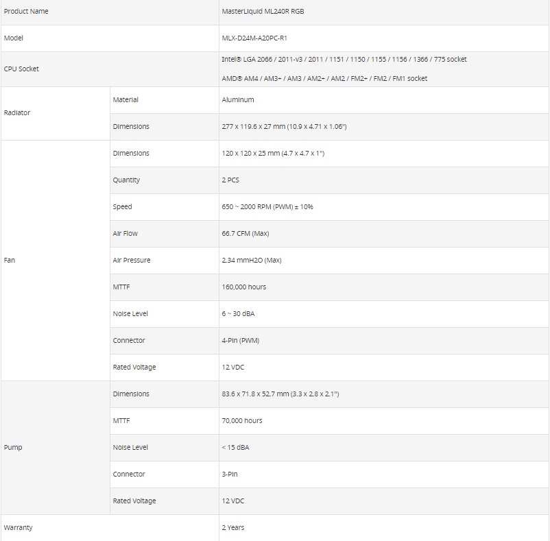 A seguire riportiamo le specifiche del dissipatore Cooler Master MasterLiquid ML240R RGB: