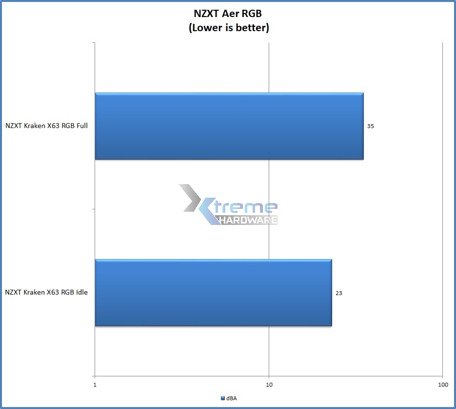 Per quanto riguarda la rumorosità delle Aer RGB da 140 mm incluse, questa al massimo dei giri è naturalmente avvertibile ma rimane comunque nella soglia tollerabile soprattutto se all’interno di un case. Infatti a livello di numeri abbiamo rilevato nel nostro caso solo 2 dBA di scarto ponendo il fonometro a circa 40 cm di distanza dalle stesse e in una configurazione ''aperta''. La pompa del Kraken X63 RGB invece è risultata inudibile durante ogni operazione e funzionamento dello stesso dissipatore a liquido.