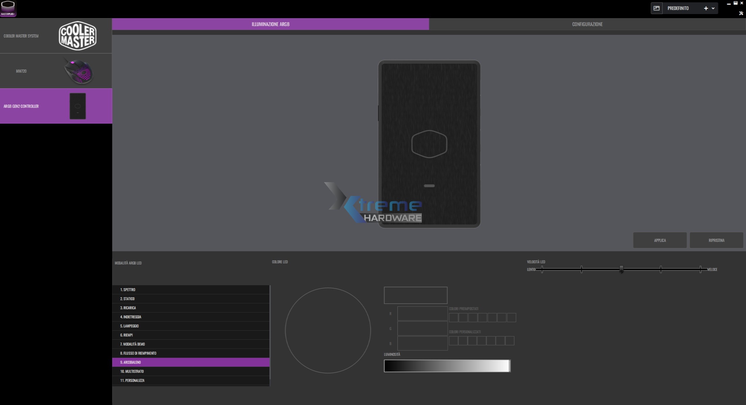 Il Cooler Master MasterLiquid PL240 Flux ci permette di sfruttare l’illuminazione RGB personalizzabile in due modi. Il primo e quello più rapido e pratico anche in fase di assemblaggio è l’utilizzo del software RGB della scheda madre. Il secondo invece vede l’utilizzo del controller incluso nel bundle e personalizzabile tramite il software di Cooler Master ovvero il MasterPlus+. In questo caso potremo gestire l’illuminazione ARGB del dissipatore direttamente tramite il software che condividerà anche altri prodotti del brand Cooler Master.