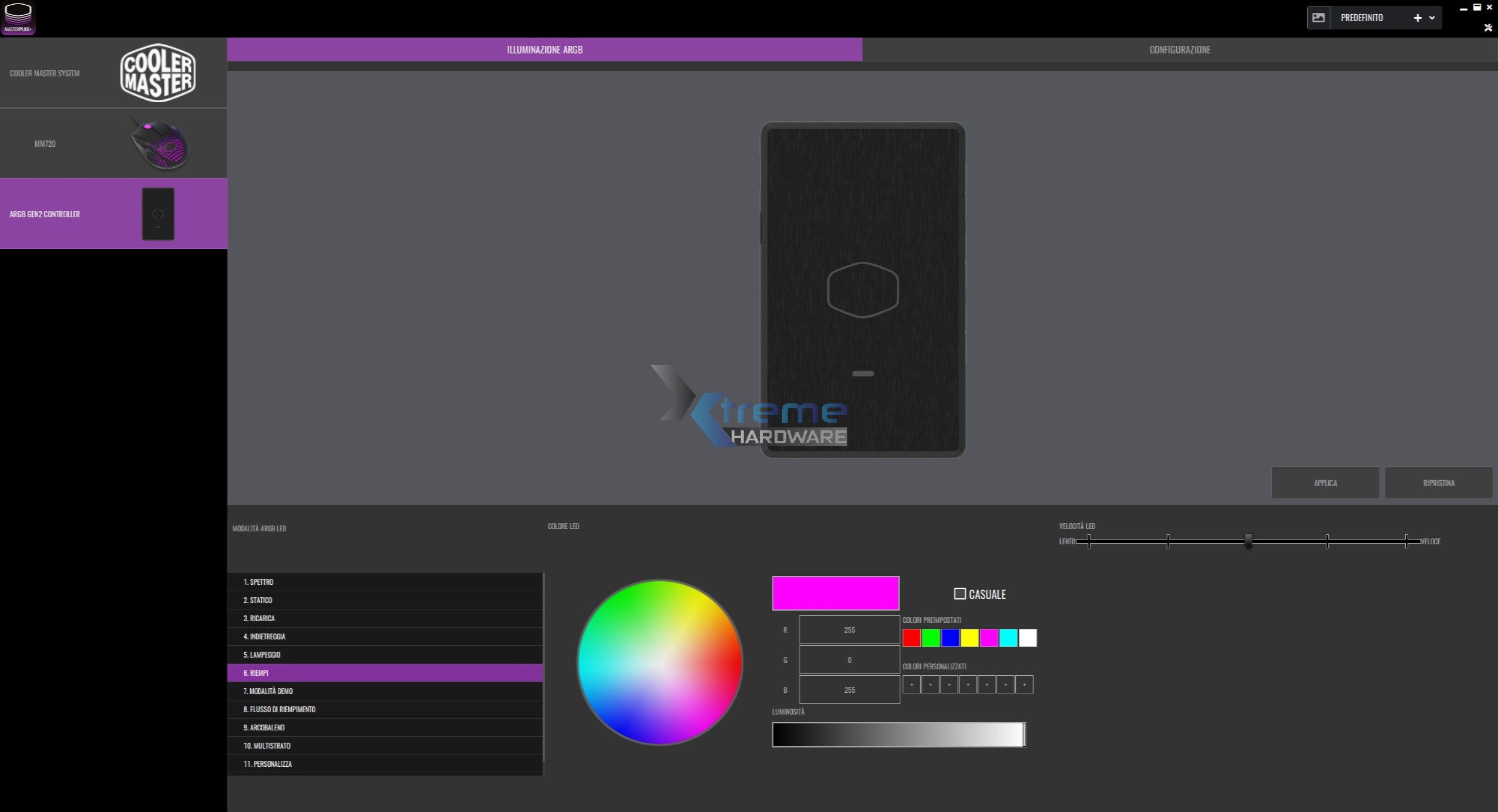 Avviato il software MasterPlus+ avremo a sinistra il rettangolo e icona relativa il controller. Cliccandoci accederemo ad un unico menu che ci permetterà di selezionare il tipo di illuminazione che vorremo impostare nonché la velocità in determinati effetti.