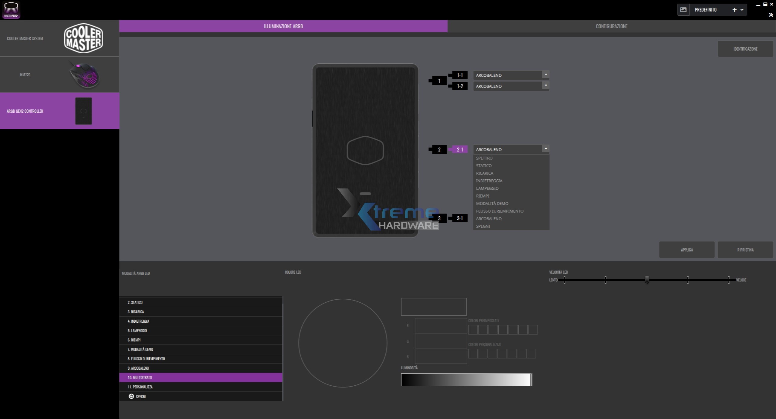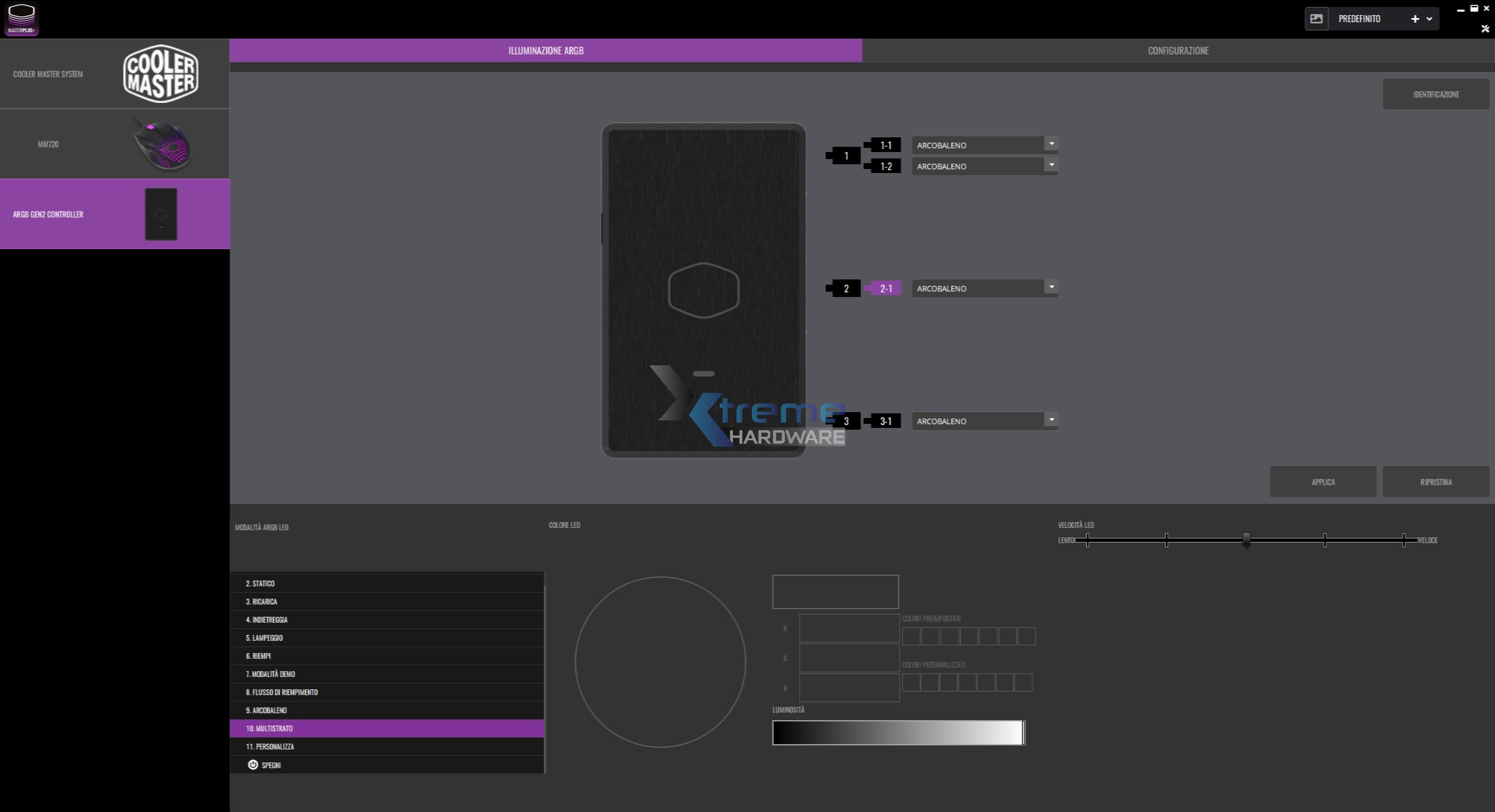 Tra i tanti effetti troviamo ‘’Multistrato’’ che come osserviamo dall’immagine a seguire ci permette di selezionare un diverso effetto per ciascuno cavo ARGB connesso. Ciò si traduce in poter impostare un singolo effetto per singola ventola e per il blocco pompa/waterblock.