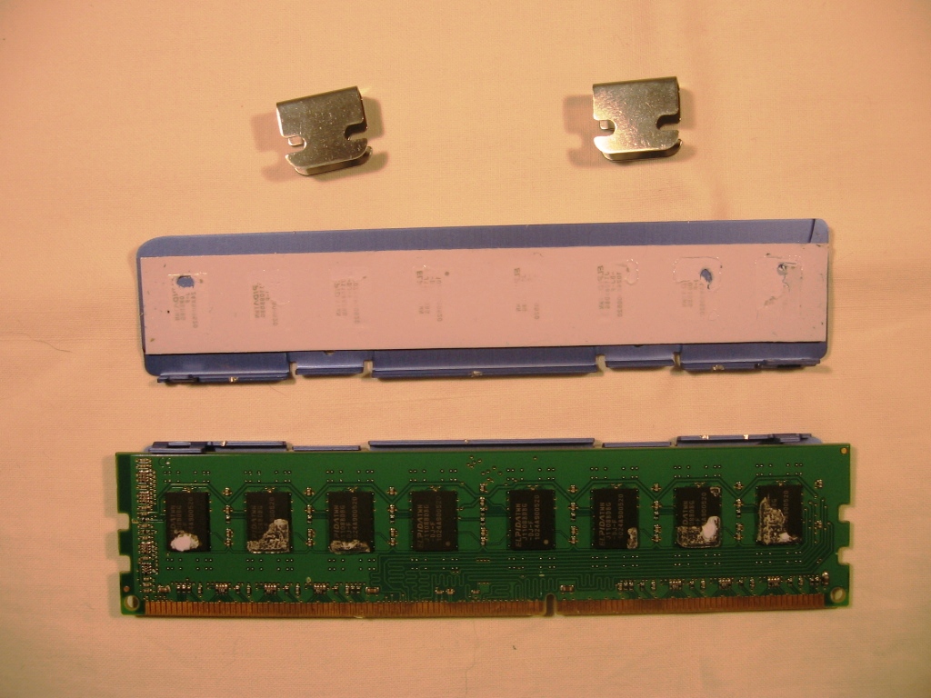 Smontando con delicatezza il dissipatore standard dei nostri 2 moduli e pulendo con dell’alcool i residui della pasta termica residua attaccata ai chip, il nostro modulo di RAM è pronto per essere assemblato.