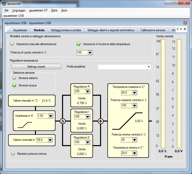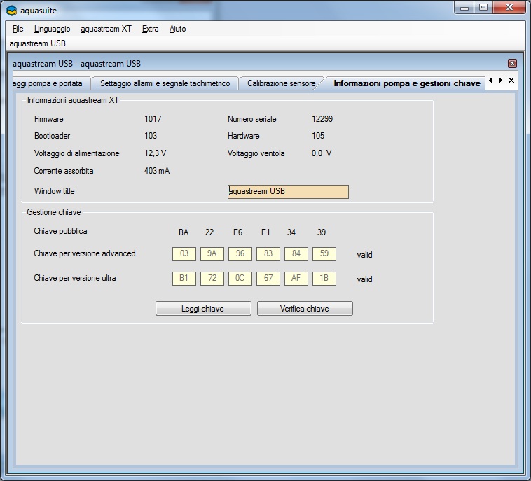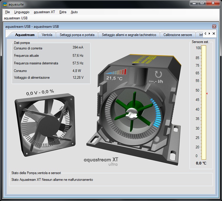 Come precedentemente detto, la caratteristica più importante di questa pompa, che si distingue dalle altre, è la sua totale gestione via software grazie al software Aquasuite fornito dalla casa madre. Una volta collegata la pompa al PC ed avviato il sistema operativo, procediamo all’installazione del software scaricato all’indirizzo http://www.aqua-computer.de/e_content/e_download.htm. All’avvio, l’applicazione Aquasuite ricercherà tra i dispositivi USB la pompa per la ricezione dei parametri di funzionamento. Una volta ricevuti, il software si presenterà come una finestra unica divisa a schede. Analizziamo le varie funzioni messe a disposizione dalle schede come mostrato di seguito.