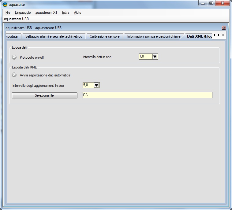 Qui sceglieremo nel riquadro in alto a sinistra la gestione della pompa tramite un controller esterno da acquistare a parte, prodotto dalla casa, per l’appunto l’Aquabus, oppure la gestione tramite USB. Nel riquadro Settaggio Frequenza, sceglieremo se lasciare impostata la gestione automatica oppure manuale della pompa. In quest’ultimo caso di seguito dovremo impostare i vari parametri desiderati. Importante anche il tasto per attivare la modalità de-aerazione. Nel riquadro Trasmetti Dati Sensore tramite Aquabus, vi è la configurazione tramite i vari sensori messi a disposizione dal controller esterno Aquabus e la calibrazione del Flussimetro.