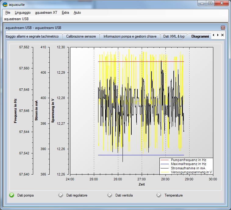 A seguire il diagramma dei dati raccolti dalla pompa. Vediamo i tre parametri messi in relazione, cioè la frequenza, l’energia assorbita dalla pompa e la tensione erogata dall’alimentatore.