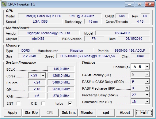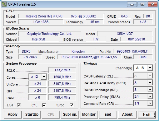 Al fine di uniformare e rendere quanto più attendibili i risultati, i test sono stati condotti con una temperatura ambiente di 21° C circa, misurati tramite termometro digitale. La CPU, un i7 975EE, è stata portata ad una frequenza di overclock di 4205 MHz per un consumo lineare sotto carico di circa 250 Watt. Per raggiungere questo carico è stato sollecitato anche il controller della memoria integrato nel processore. Le RAM usate per il test, delle Kingston, sono state portate sia ad una frequenza di default di 1600 MHz con timing 8-8-8-24 che in overclock ad una frequenza di 1740 MHz con timing CL7-7-7-20 1T. Nelle figure a seguire la configurazione di default e quella sotto overclock.