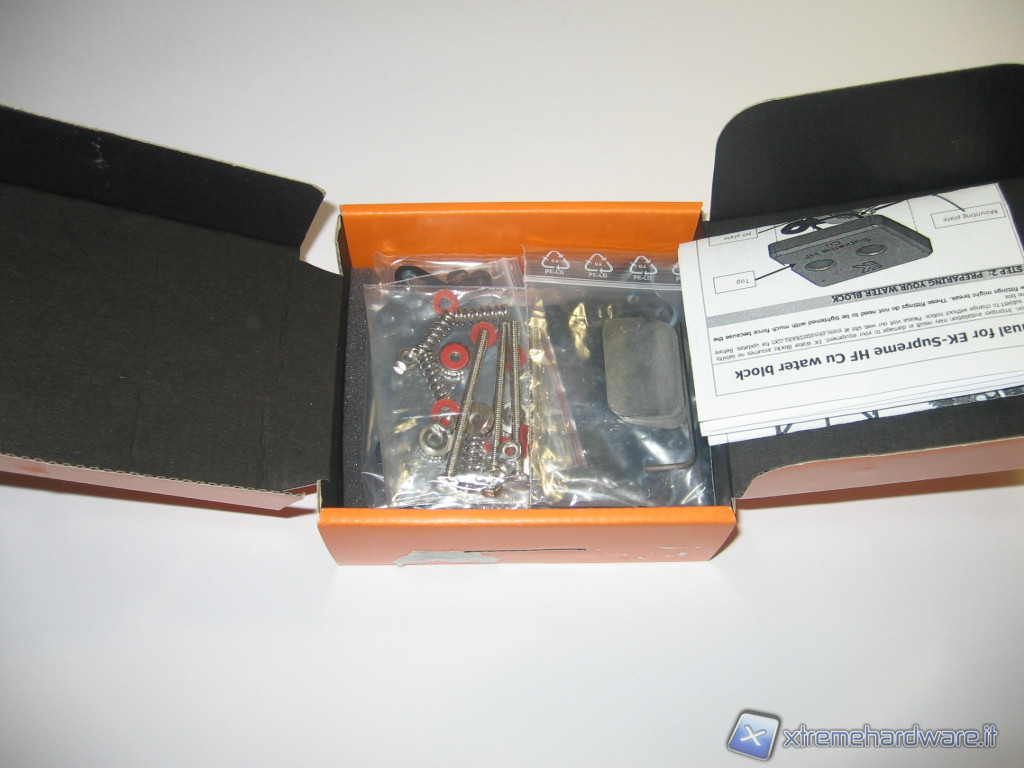 A seguire, troviamo il waterblock protetto da una spugna poliuretanica che lo protegge dagli urti oltre ad essere racchiuso in una bustina trasparente atta a proteggerlo dagli agenti atmosferici sempre pronti ad intaccare il rame ossidandolo. E’ presente inoltre la classica bustina che racchiude la viteria e le staffe di fissaggio e per finire una confezione di pasta termoconduttiva di qualità, parliamo della Artic Cooling MX-2. Dalle foto potete vedere quanto descritto.
