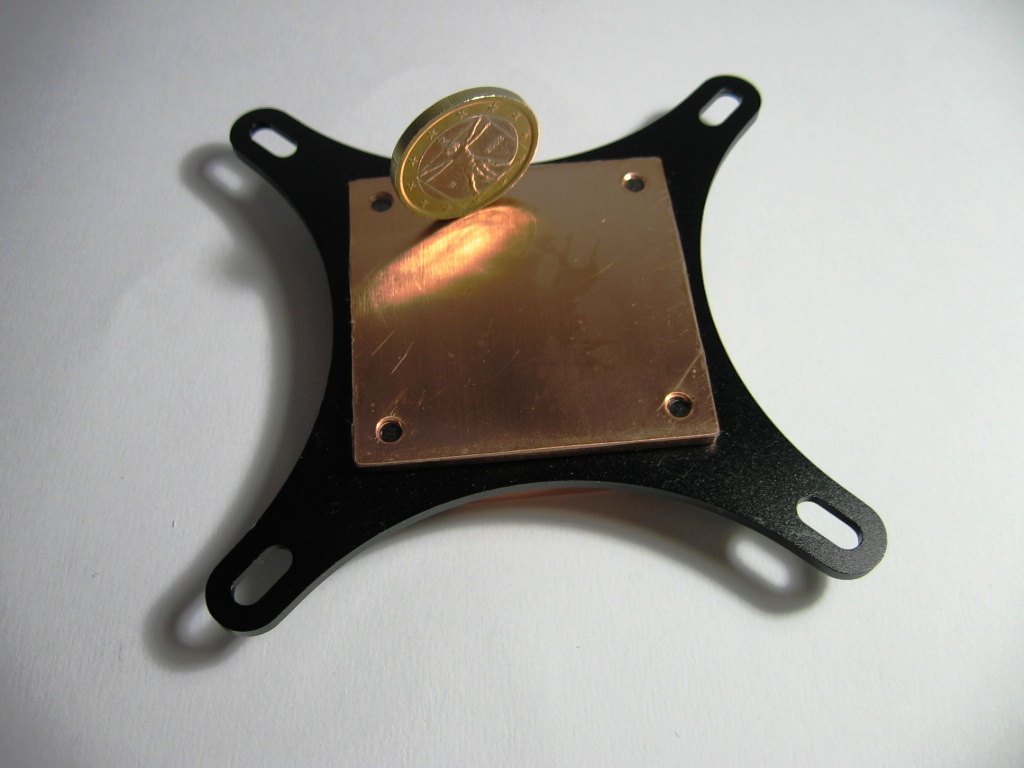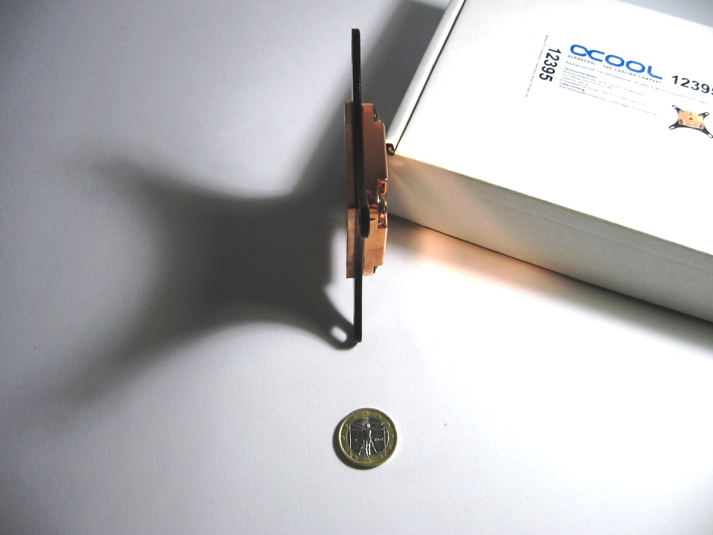 La parte sottostante (base di contatto) è come da scelta migliore in rame. Avremmo preferito una levigatura più fine ed a specchio per migliorare il contatto e quindi la dissipazione del calore. Il waterblock di per se non è molto spesso, notate il riferimento con la moneta.
