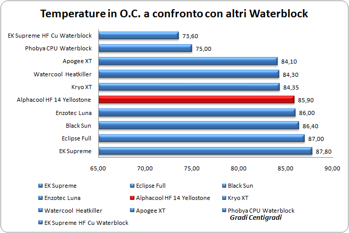 Possiamo notare come il waterblock Alphacool HF14 Yellowstone non riesce a distinguersi ma rimane nella media.