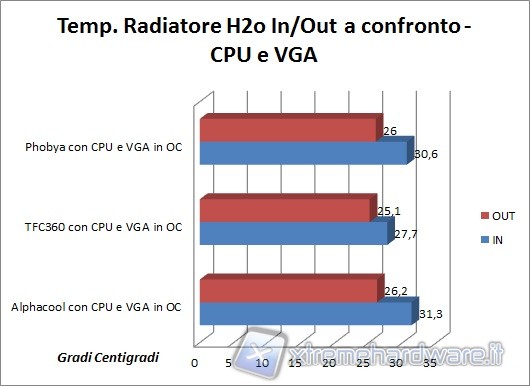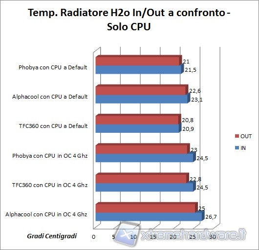 Partiamo con la presentazione dei risultati comparativi raffreddando la sola CPU sia con freq. a default sia sotto overclock a 4014 MHz,  mostrando le differenze rilevate sulla temperatura del liquido in entrata e all’uscita dal radiatore. Ci sembra irrilevante segnalare anche le differenze sul processore, ma possiamo dirvi che siamo in un range tra i 45° a riposo e gli 80° in full load.