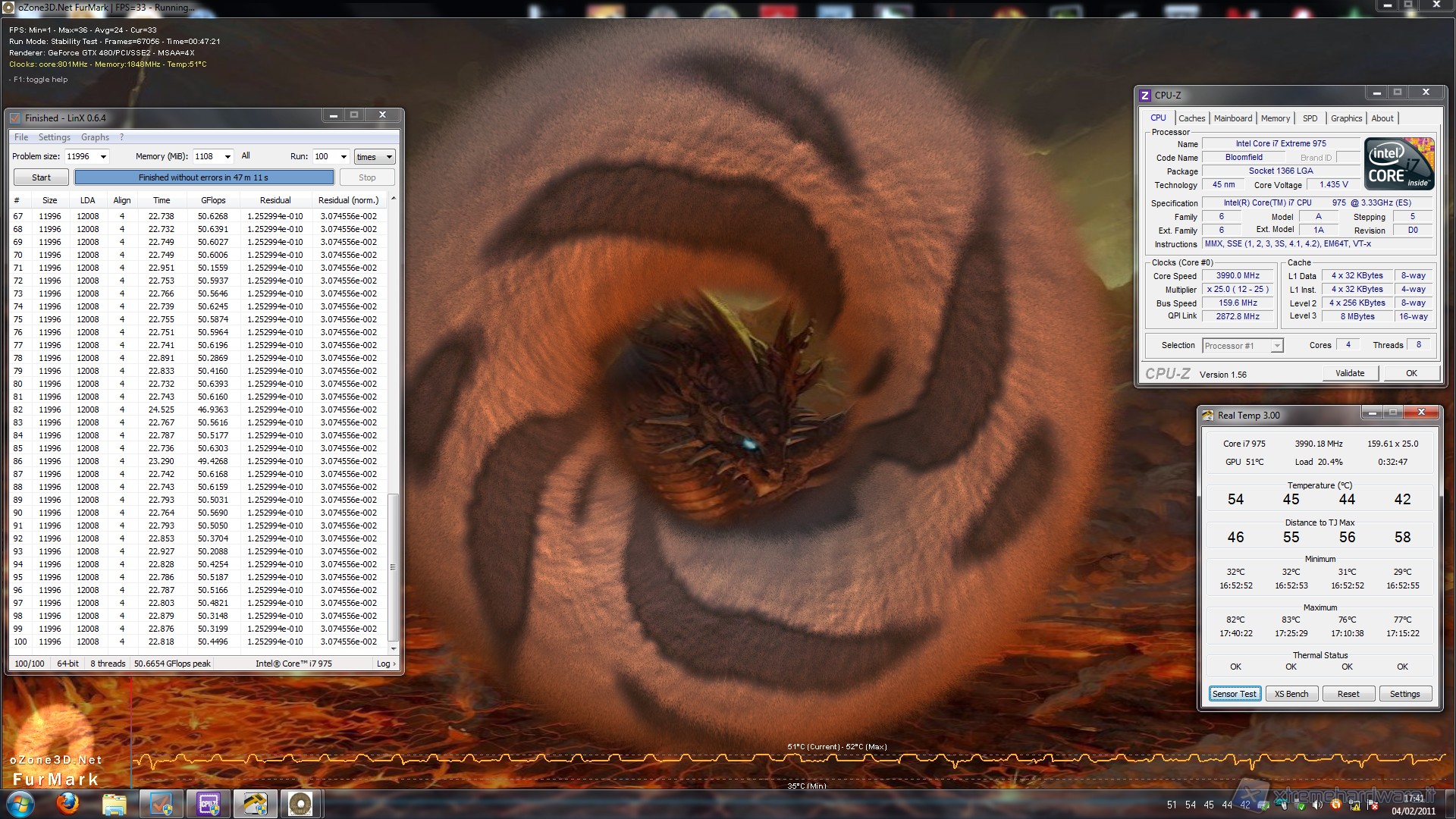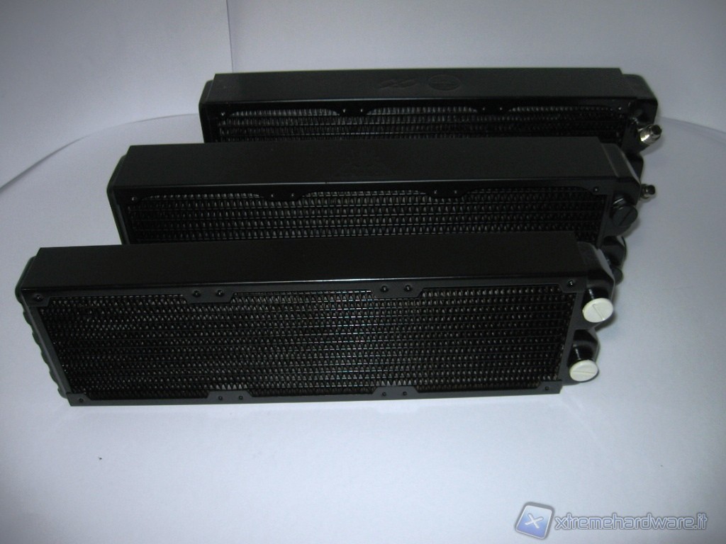 Come accennato sopra per sollecitare i due componenti primari sono stati usati appositi programmi. LinX per il processore, molto apprezzato in rete come programma di torture test, si basa sulle librerie Linpack e consente di stressare la CPU per verificarne la stabilità di funzionamento portando il carico su di essa al 100% su tutti i core, sia fisici che logici. La sua efficienza è dimostrata dal fatto che è molto difficile completare con successo i cicli impostati. A conferma di ciò è la temperatura generata dalla CPU una volta avviato il test, un vero torture test. A titolo di paragone rispetto a Prime95 le temperature massime raggiunte da LinX sono superiori di 3° – 5°. Per sollecitare la GPU Fermi, che come si sa è il primo step che ha equipaggiato i modelli di punta dello scorso anno di Nvidia, poi rimpiazzata dallo step successivo il GF110 sulla scheda video GTX580 molto più fredda e performante, è stato usato il programma Furmark. Furmark è conosciuto in rete principalmente per verificare la stabilità della VGA sotto stress. E’ basato sulle librerie OpenGL ed utilizza speciali algoritmi che portano il calcolo computazionale della GPU al 100%. Abbiamo eseguito più livelli di test: dapprima solo la CPU, con la VGA esclusa dall’impianto a liquido e raffreddata ad aria e quindi la CPU sottoposta ad overclock in modo da evidenziare la scalabilità in termini di efficienza del radiatore. Non contenti e visti gli ottimi valori di risposta abbiamo reso la situazione ancor più critica, mettendo sotto liquido anche la VGA, rilanciando i test sia a default (CPU e VGA) che in overclock. Per verificarne l’efficacia e la bontà, il radiatore NexXxos Xtreme III Rev.2 è stato messo a confronto con 2 modelli, ed esattamente il TFC X-Changer 360 e il Phobya G-Changer 360.