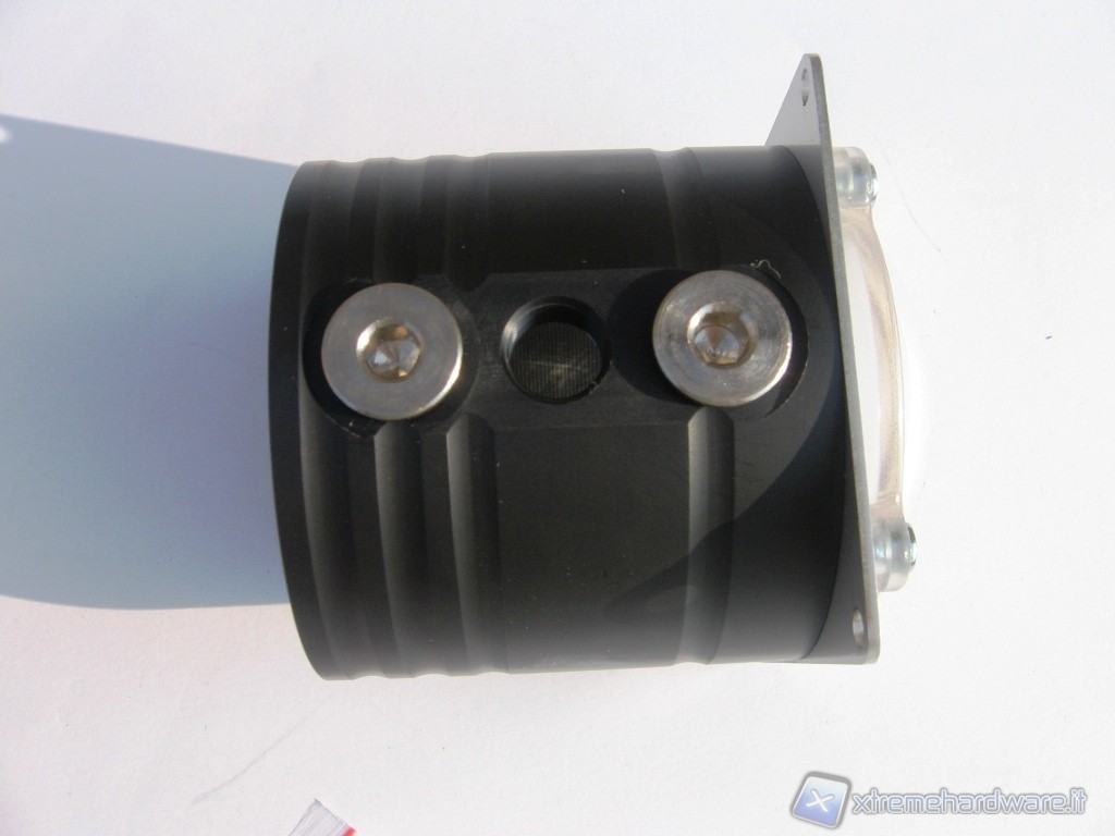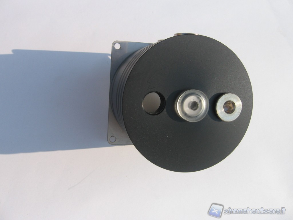 Di forma circolare, ha numerosi fori filettati da 1/4" per l’attacco sia dei raccordi per l’entrata e l’uscita del liquido, sia di eventuali sensori per rilevare la temperatura del liquido. Ne troviamo 3 sulla parte superiore e 3 lateralmente. Tutti questi attacchi sono molto comodi perché la vaschetta può alimentare più circuiti separati e quindi più pompe.