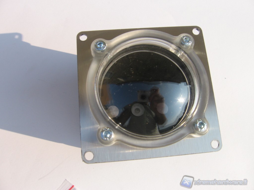 La staffa è realizzata in acciaio satinato ed ha il semplice scopo di fare da sostegno e supporto di aggancio. Tramite i 4 fori dovrà essere fissata al pannello e potrà essere sostituita con altri tipi di staffe di altre forme e misure. Ne troverete vari modelli sul sito del rivenditore Alphacool, Aquatuning.de. Stesso discorso per il frontale trasparente convesso, è sostituibile svitando le apposite 4 viti e reperibile per pochi euro sempre sul sito indicato.