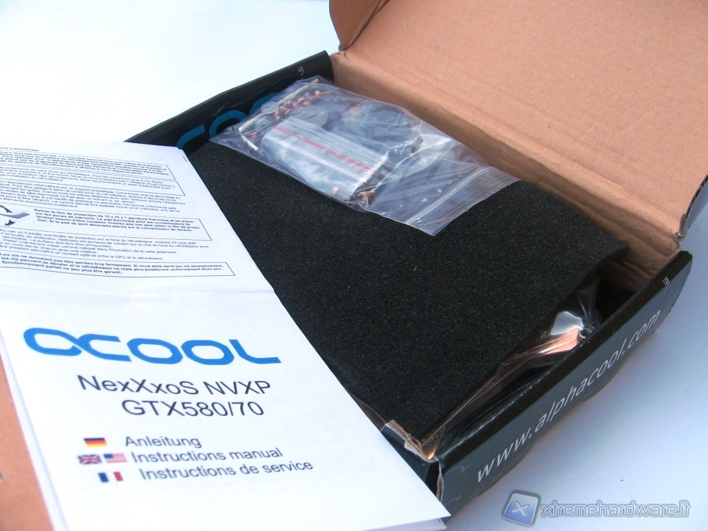 Oltre a questo troviamo pezzi di Pad Termico per il contatto del waterblock con i vari chip di RAM e di alimentazione sparsi sul PCB della VGA. Non ultima una siringa di pasta termica da spalmare sulla GPU per favorire il perfetto contatto e trasferimento del calore al waterblock e 2 tappi che vanno utilizzati nel caso di una sola VGA.