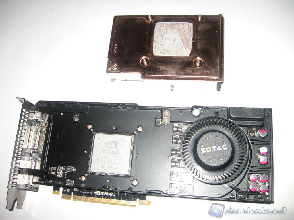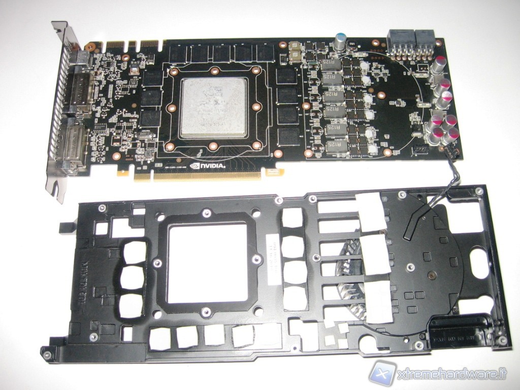 Con una leggera pressione, delicatamente, dovrebbe venir via lo scheletro in metallo. Esso ha una duplice funzione: da un lato provvede al raffreddamento dei vari chip di RAM e di alimentazione mentre dall’altro ha l’importantissima funzione di sostegno, per evitare eventuali torsioni che potrebbero danneggiare la scheda video.