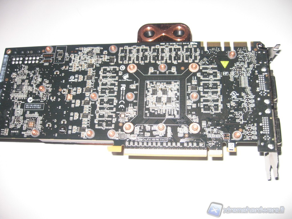 Ed ecco come risulta la scheda video accoppiata al waterblock Alphacool NexXxos NVXP GTX580/70. I 2 tappi in dotazione servono per chiudere 2 dei 4 fori, nel caso si abbia una sola scheda video da inserire nel circuito di raffreddamento a liquido. Dopo aver spurgato l’impianto dall’aria e controllato che non ci fossero perdite di liquido, abbiamo inserito la scheda video nello slot PCI-E della motherboard ed avviato il nostro PC.